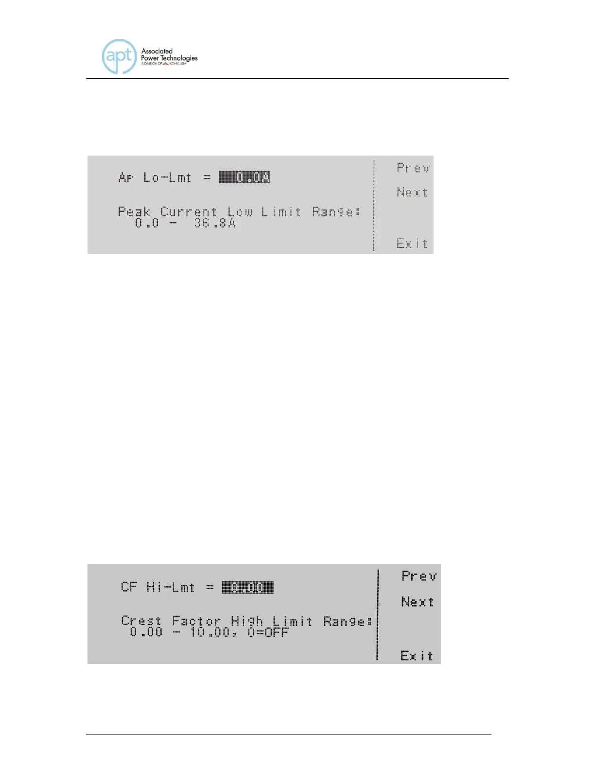 CF Hi-Lmt = indicates the crest factor high limit that is programmed into the