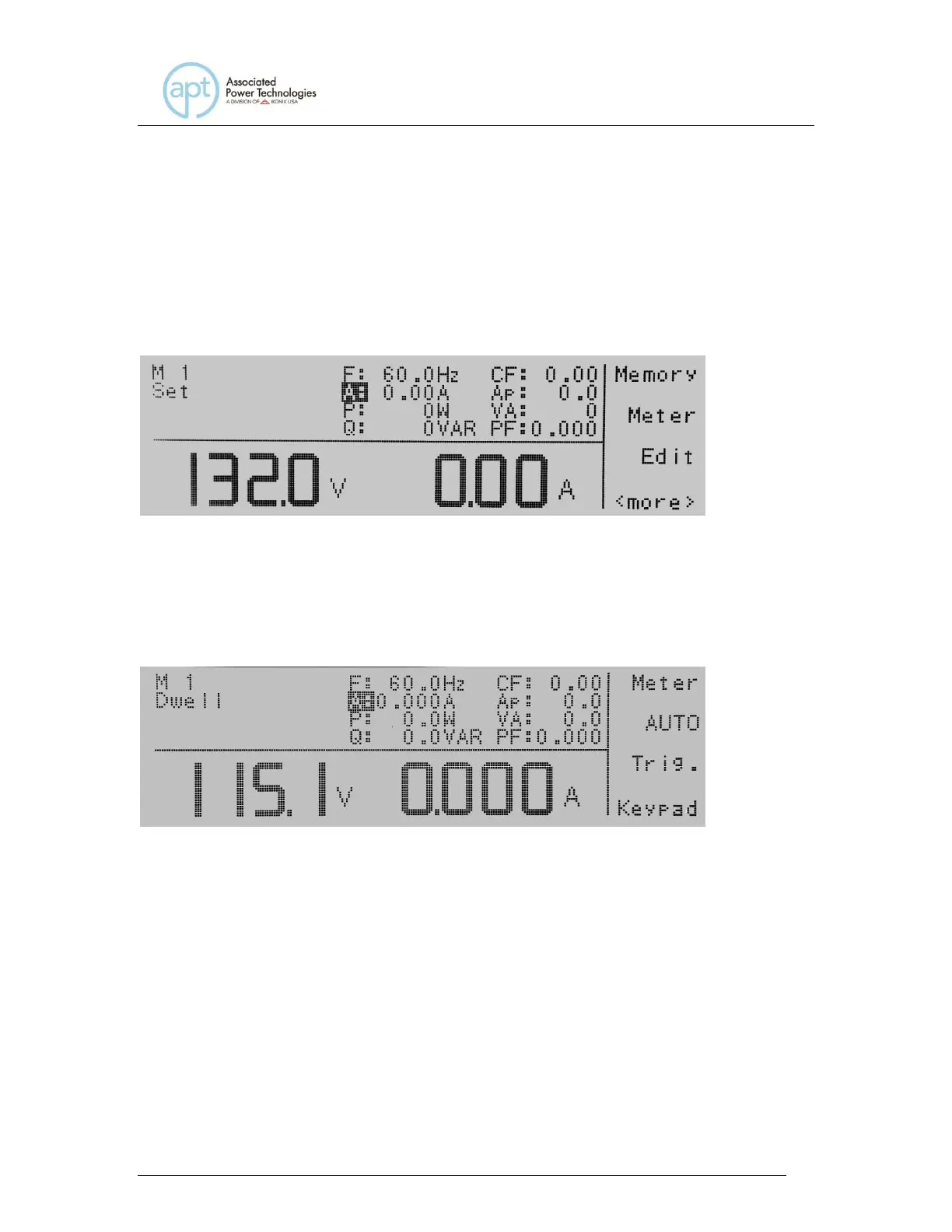 parameters of F:, A:, P:, Q:, CF:, Ap:, VA:, PF:, and the display will read the
