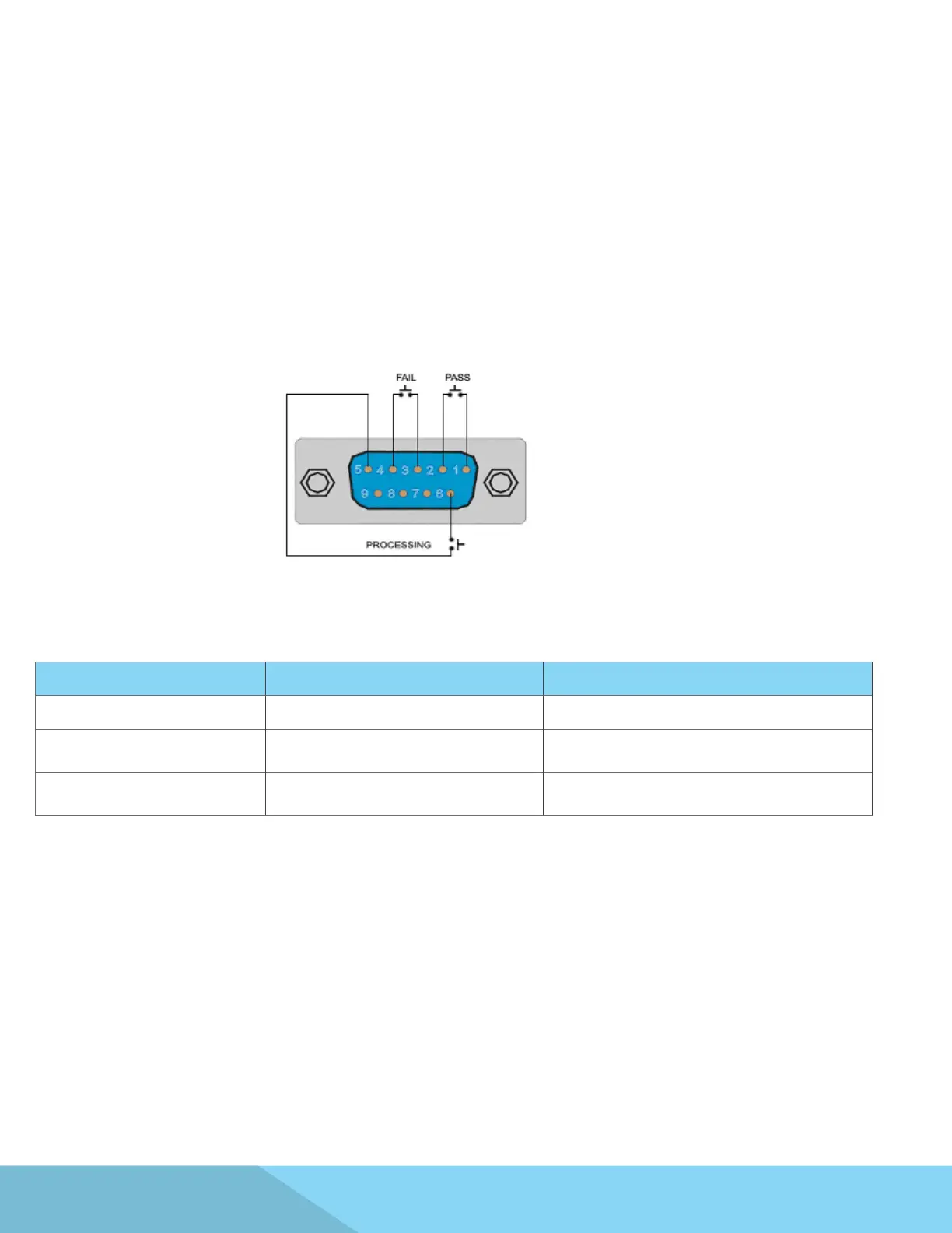 PASS, FAIL, and PROCESSING conditions via a 9-Pin D-type connector. When a terminal becomes active the