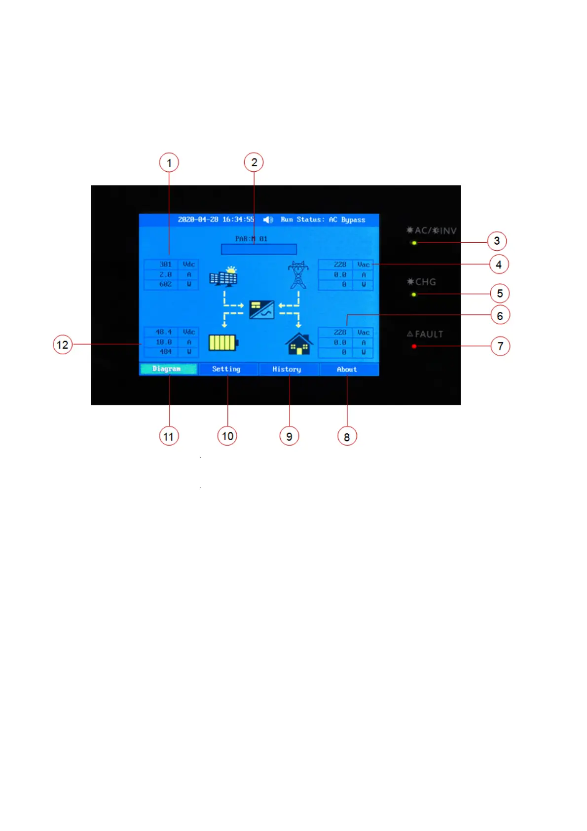 The operation and display panel, shown in below chart, is on the front panel of the inverter. It includes three