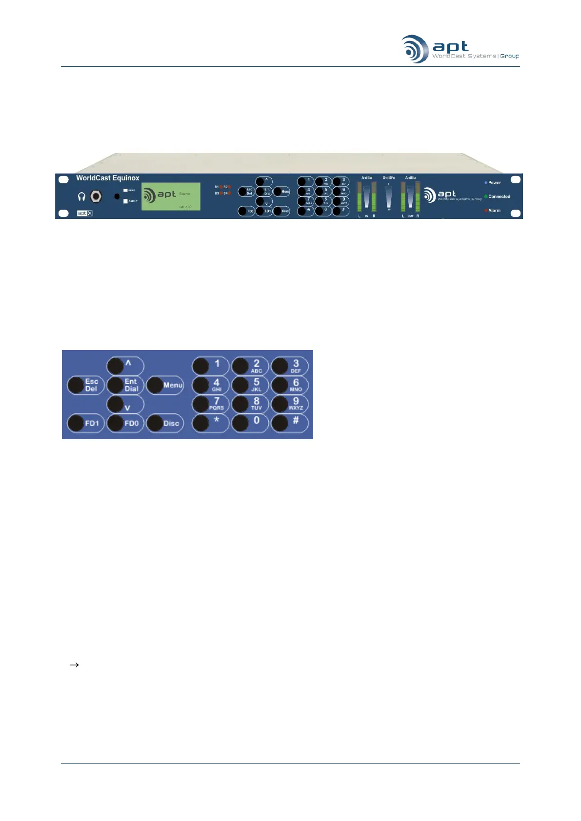 The front panel of the WorldCast Equinox comprises a keypad (used for manually controlling the WorldCast