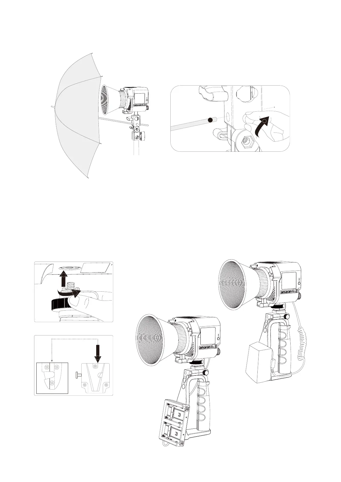 Tighten the lamp body and the battery handle via 1/4 screw, then attach the battery plate or V-mount