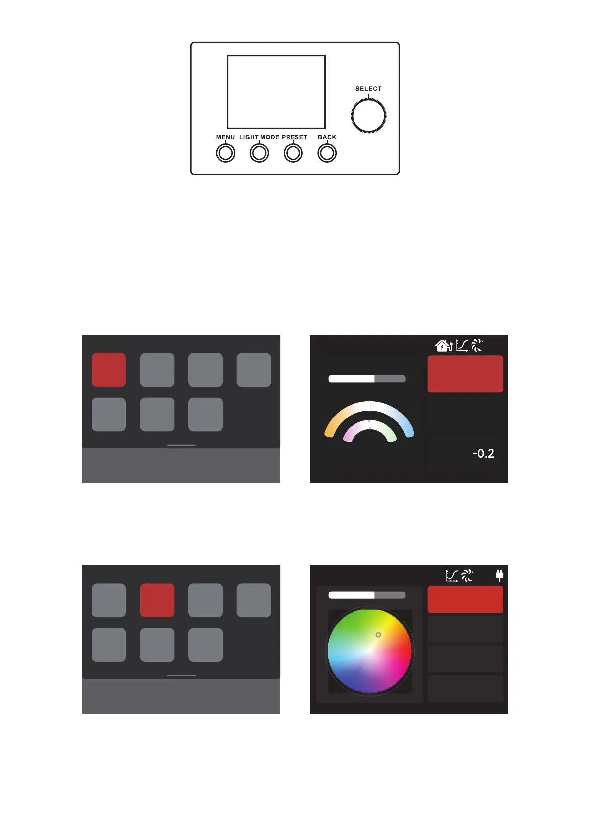 Press the “Light Mode” button to enter the menu interface, which consists of CCT, Adv.HSI, RGB, GEL, XY,
