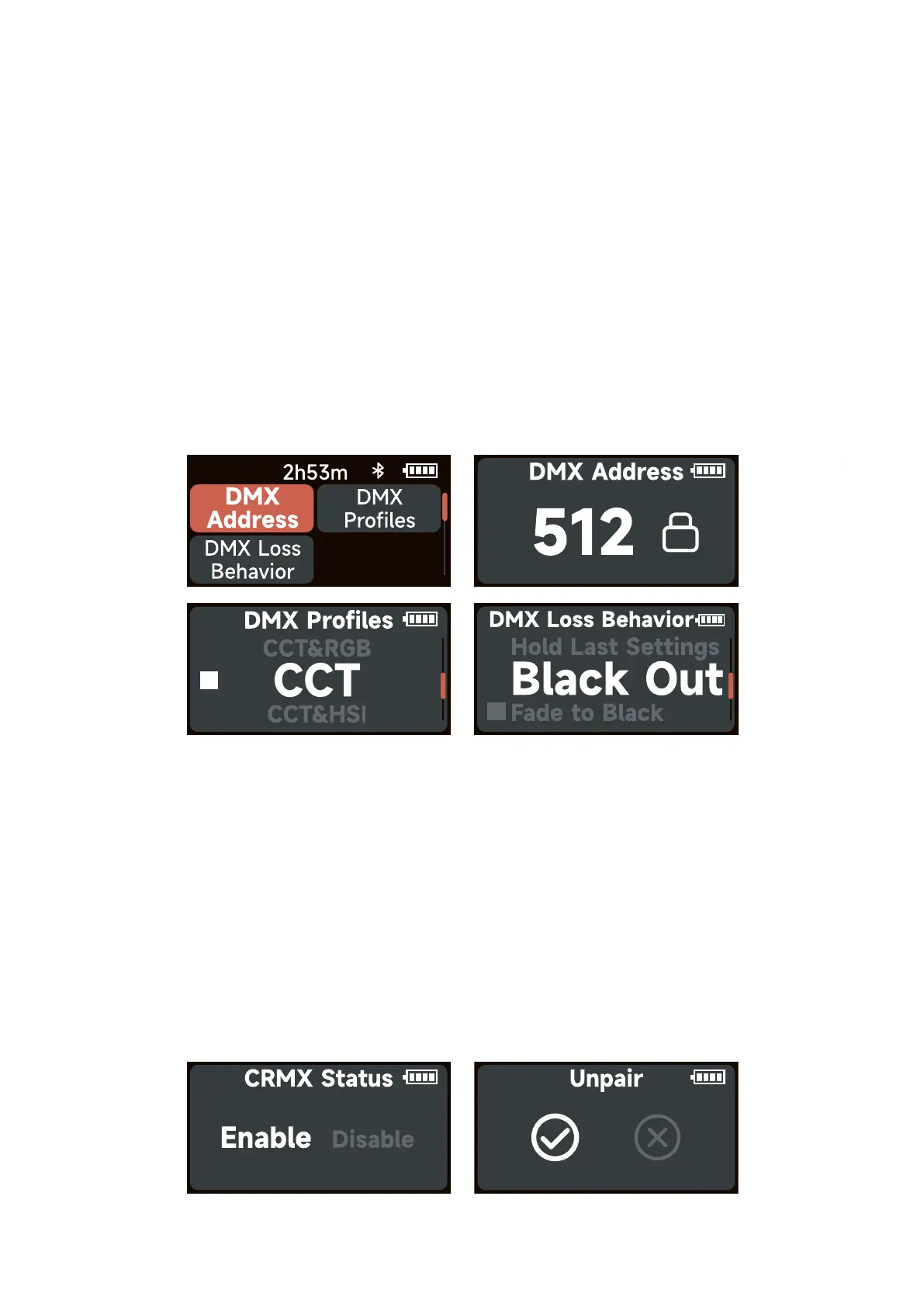 Rotate and press the knob to select CRMX Settings in DMX Settings.