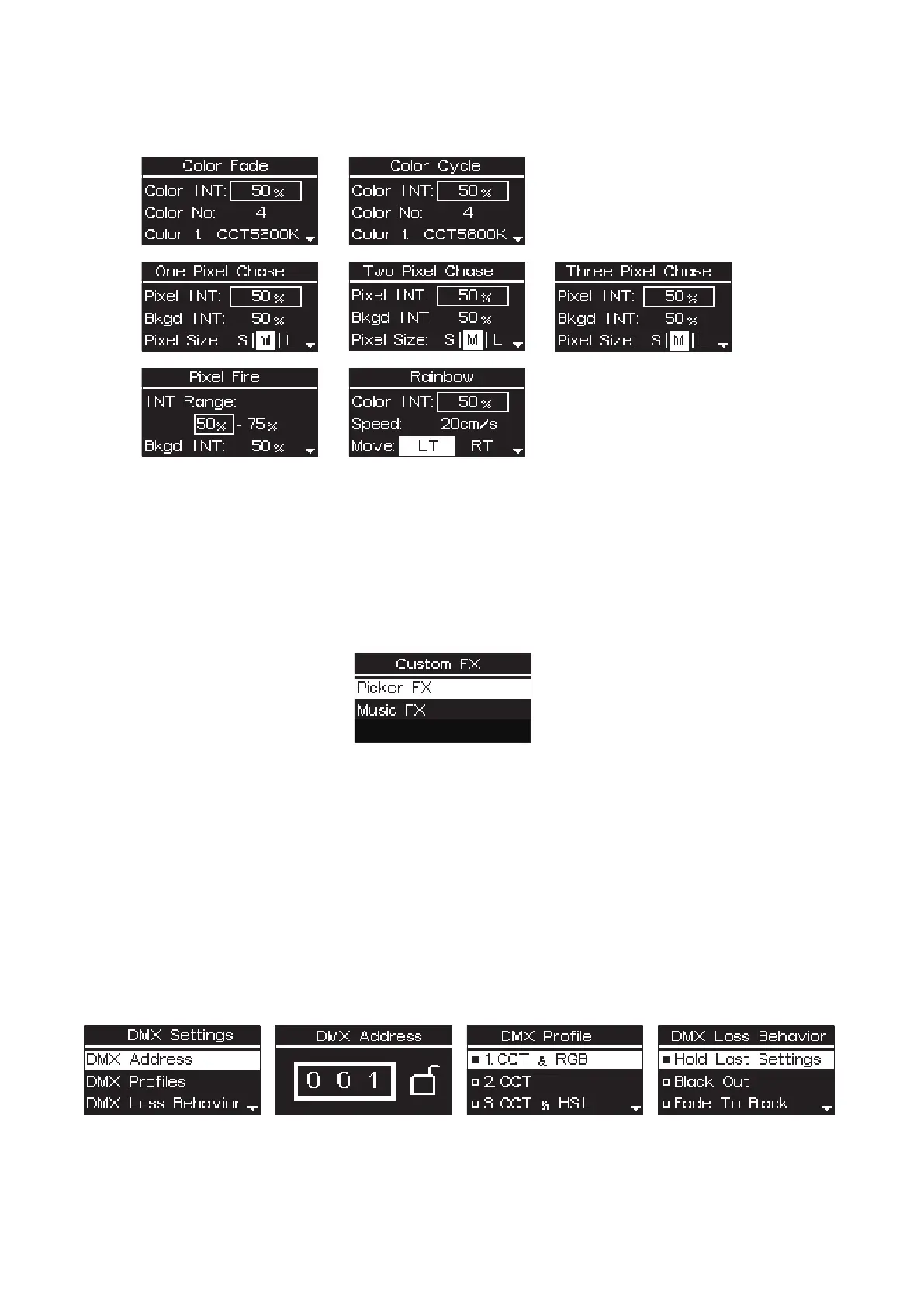 Cycle / One Pixel Chase / Two Pixel Chase / Three Pixel Chase / Rainbow / Pixel Fire.