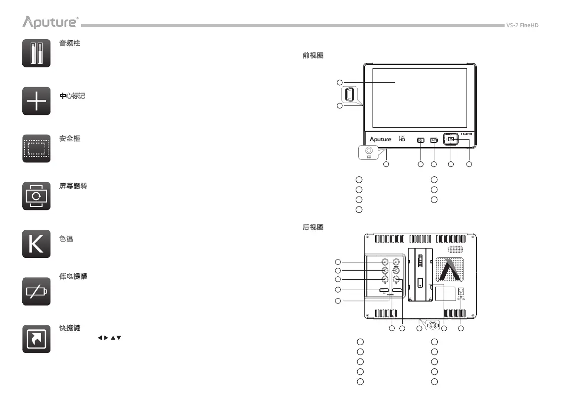 色显示、复合曝光、辅助对焦、亮度直方图、音频柱、自发彩条、相机
