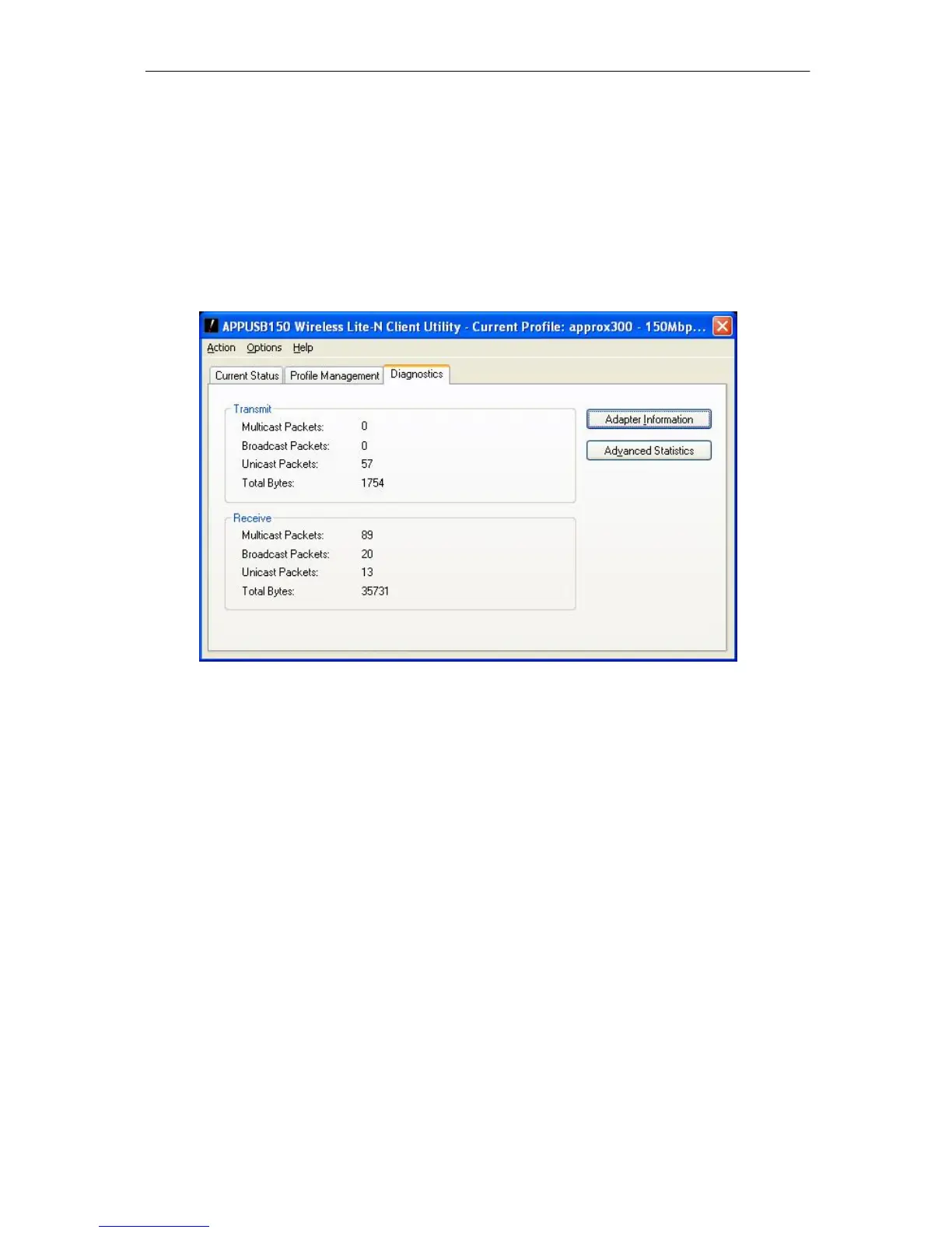 La pestaña Diagnostics muestra la siguiente info rmación de recepción y transmisión p ara los