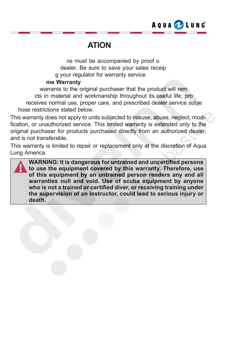 Aqua Lung warrants to the original purchaser that the product will remain free