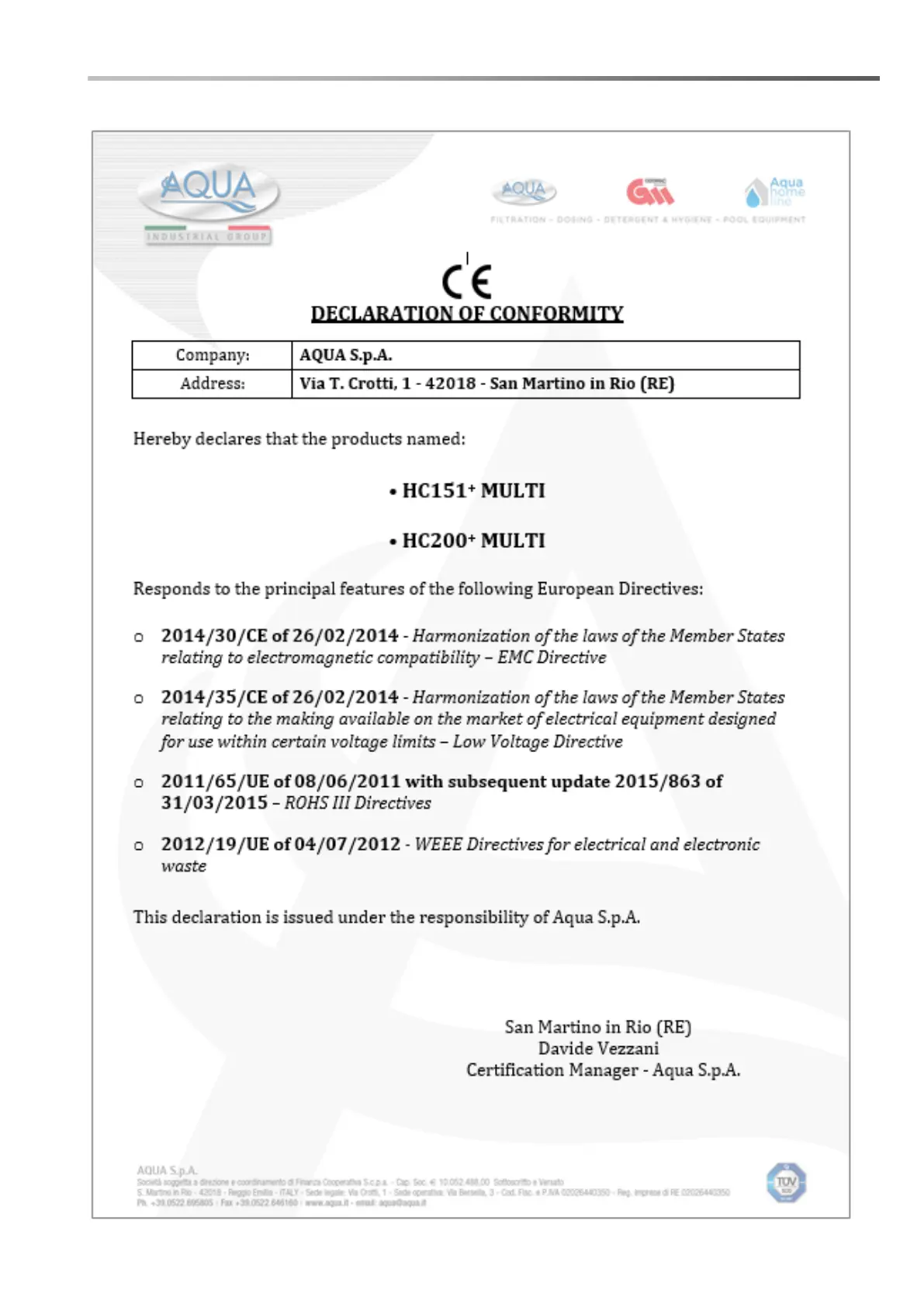 Aqua HC151+ MULTI - Declaration of Conformity; Company and Address; European Directives Compliance