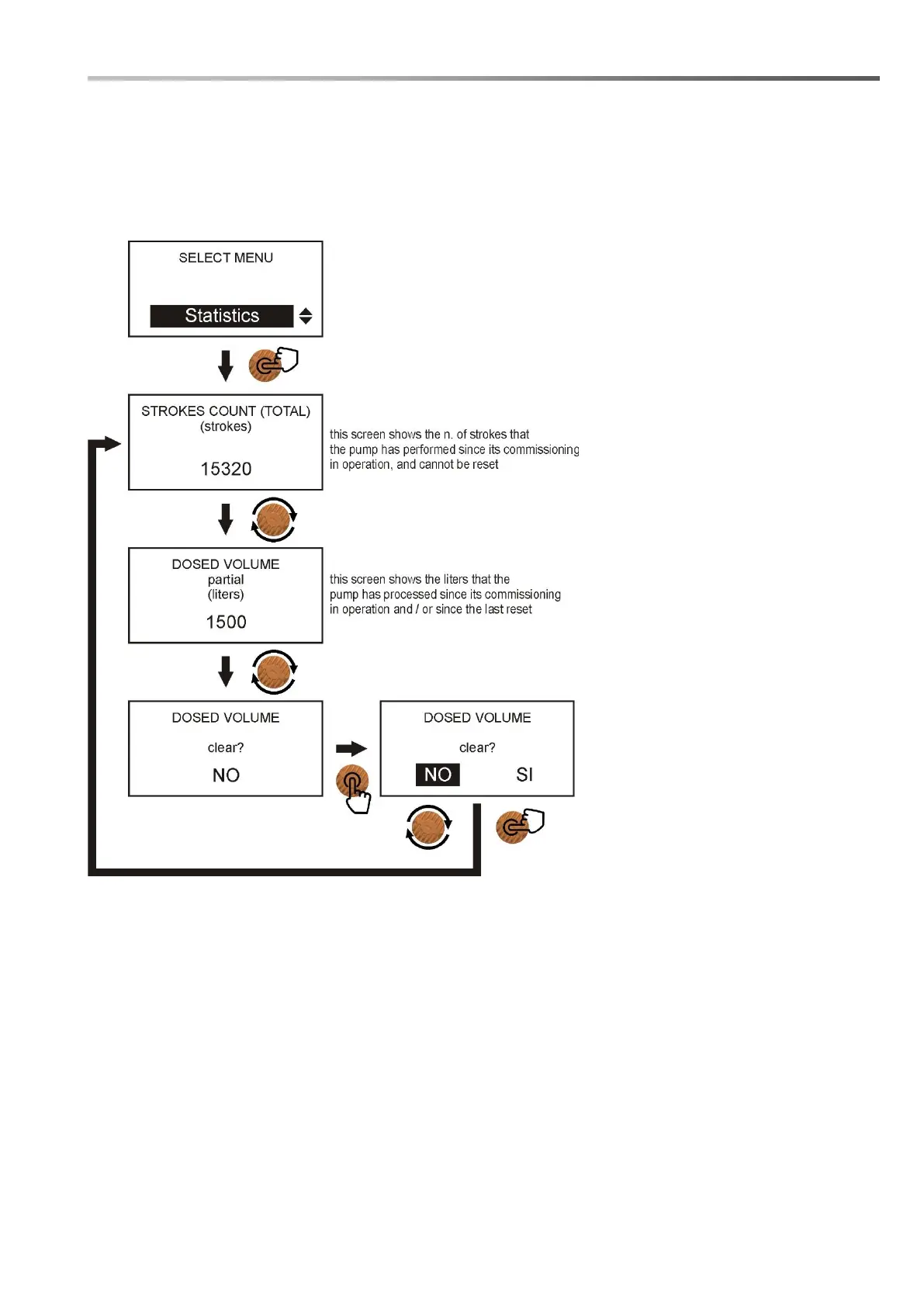 viewed within the "STATISTICS" menu. In this menu you can find the number of total strokes and the volume