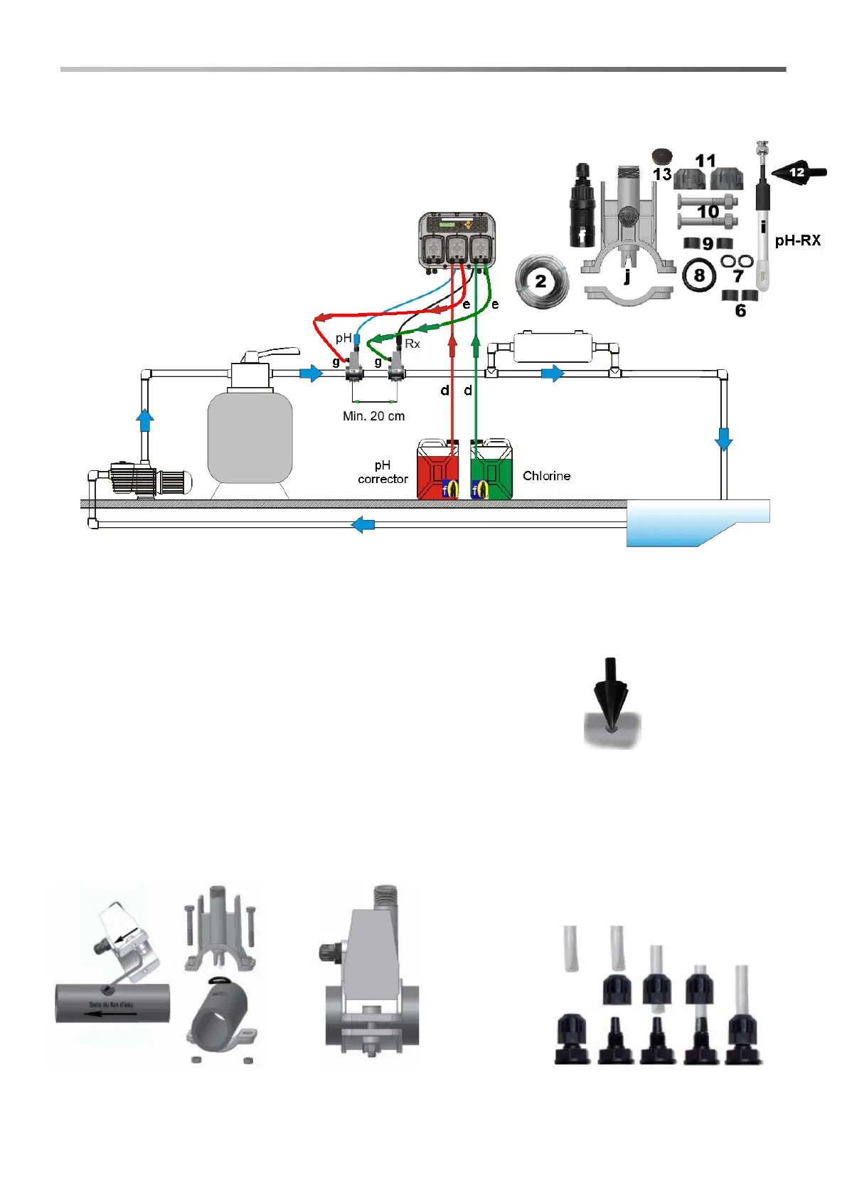 - The injection probe holder (j) can be installed on a DN50 or DN60 PVC tube, after a 24mm hole has been drilled