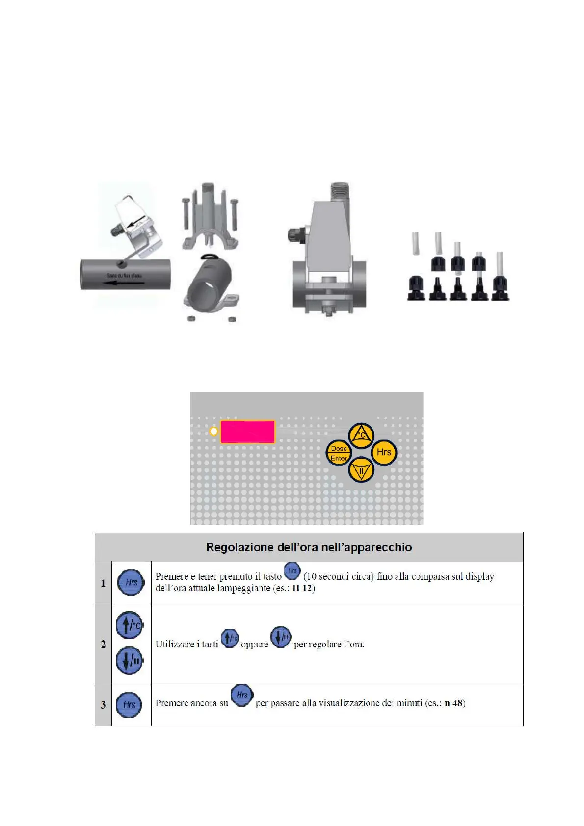 - Inserire le due viti (se il tubo è DN63 utilizzare i due distanziali (rif. 9) tra il porta-sonda superiore e il