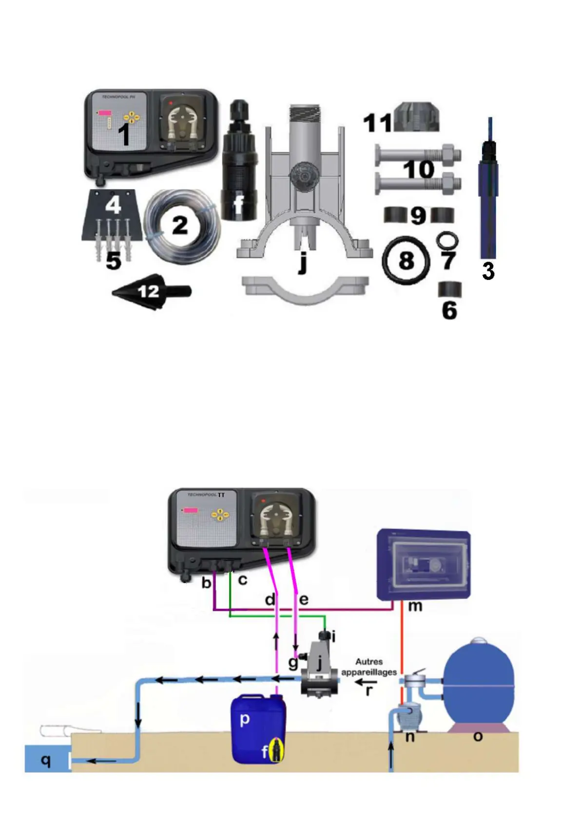 1 Regulador / doseador Technopool TT 2 Tubos de sucção / injecção