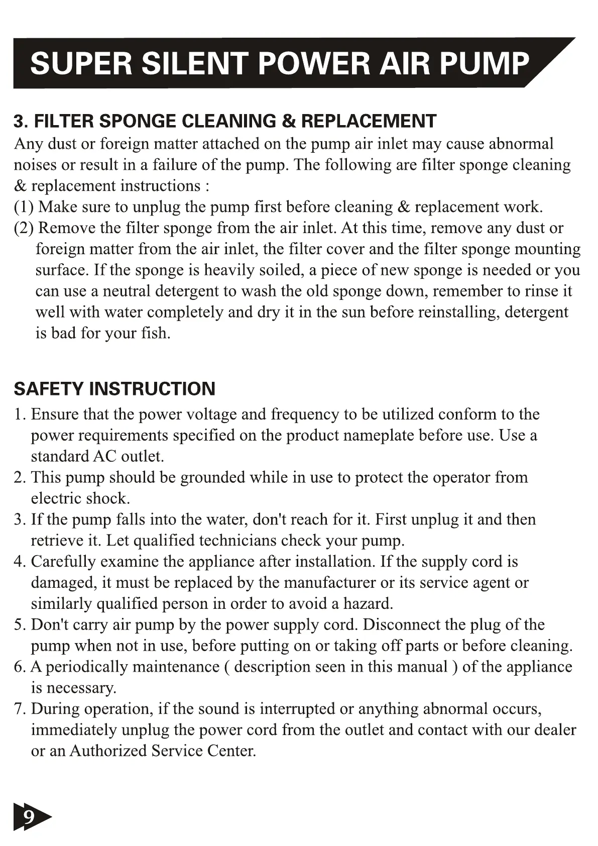 aquaforte V-10 - Filter Sponge Cleaning & Replacement; Safety Instruction; General Safety Warnings
