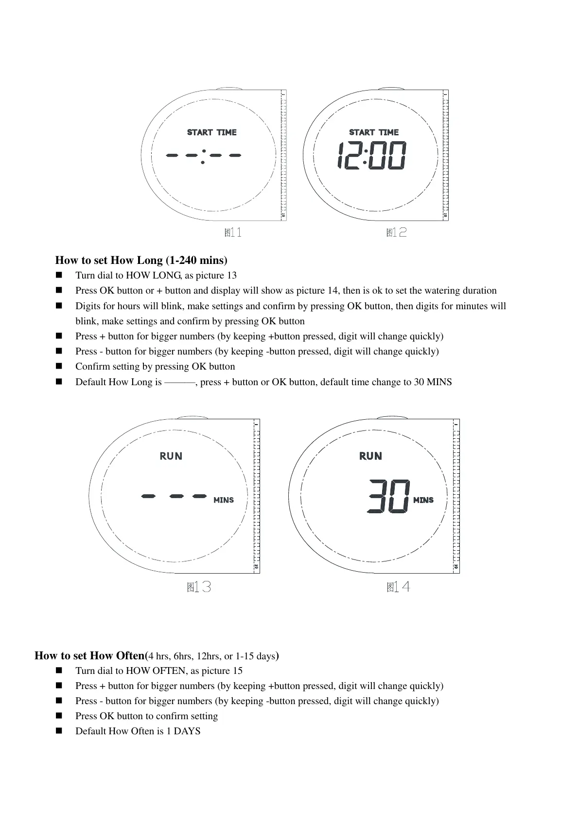 Press OK button or + button and display will show as picture 14, then is ok to set the watering duration