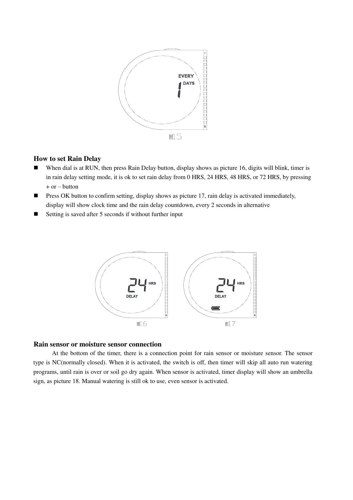 Press OK button to confirm setting, display shows as picture 17, rain delay is activated immediately,