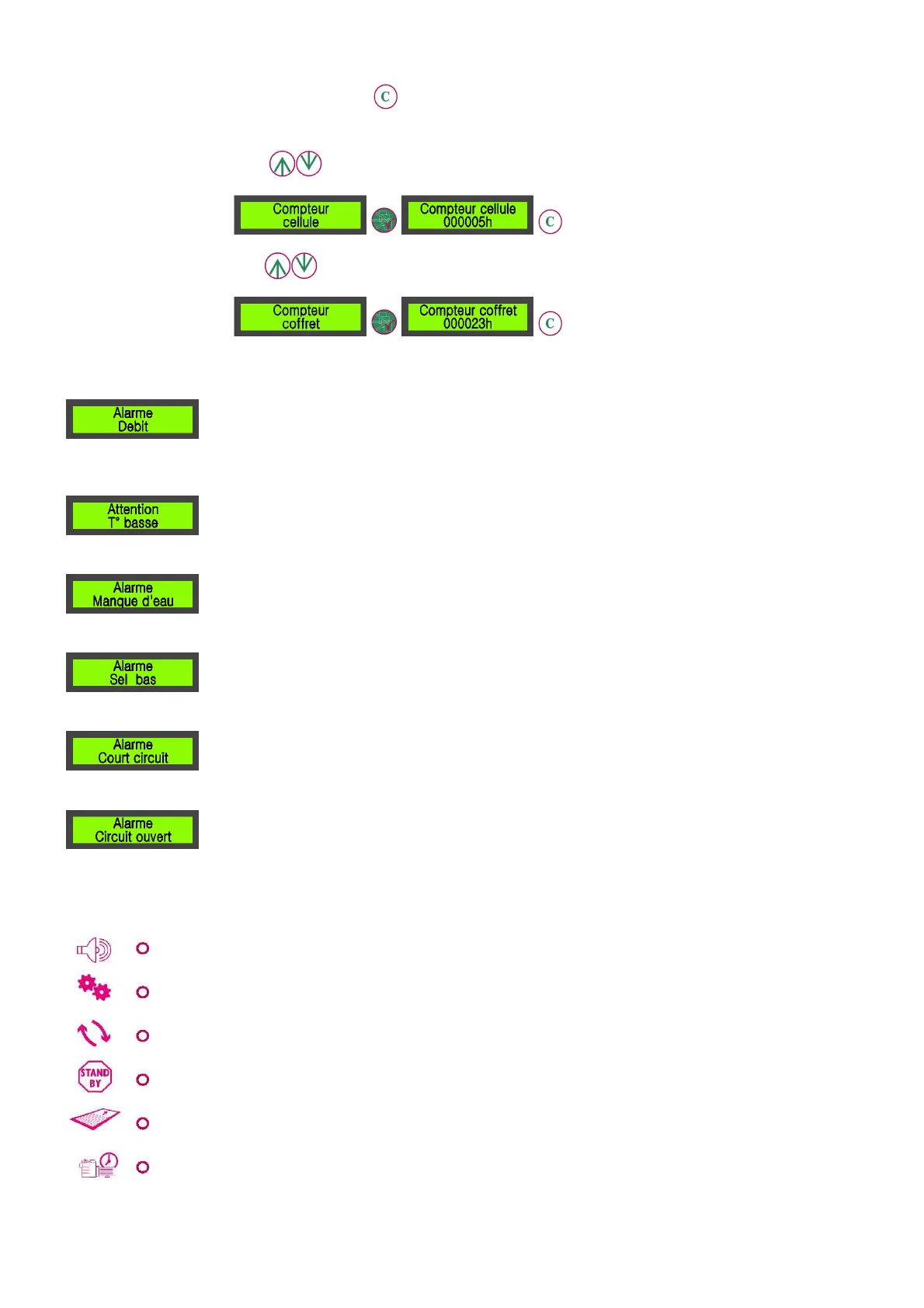 Indique une absence ou un débit d’eau trop faible dans le circuit hydraulique de la cellule d’électrolyse