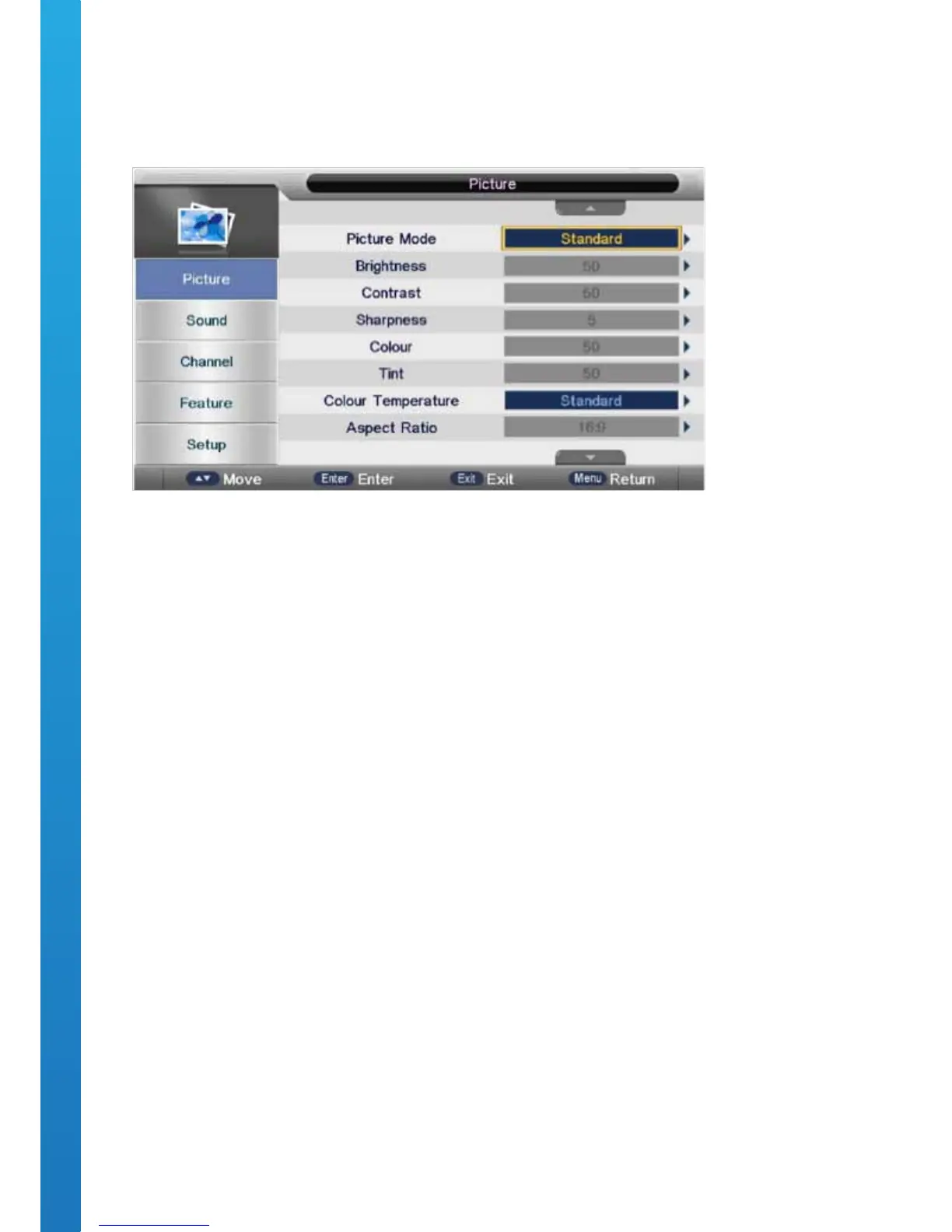 Press ▼ / ▲ buttons to select Colour, then press the OK button to enter the sub-menu. Press ◄ / ► button to