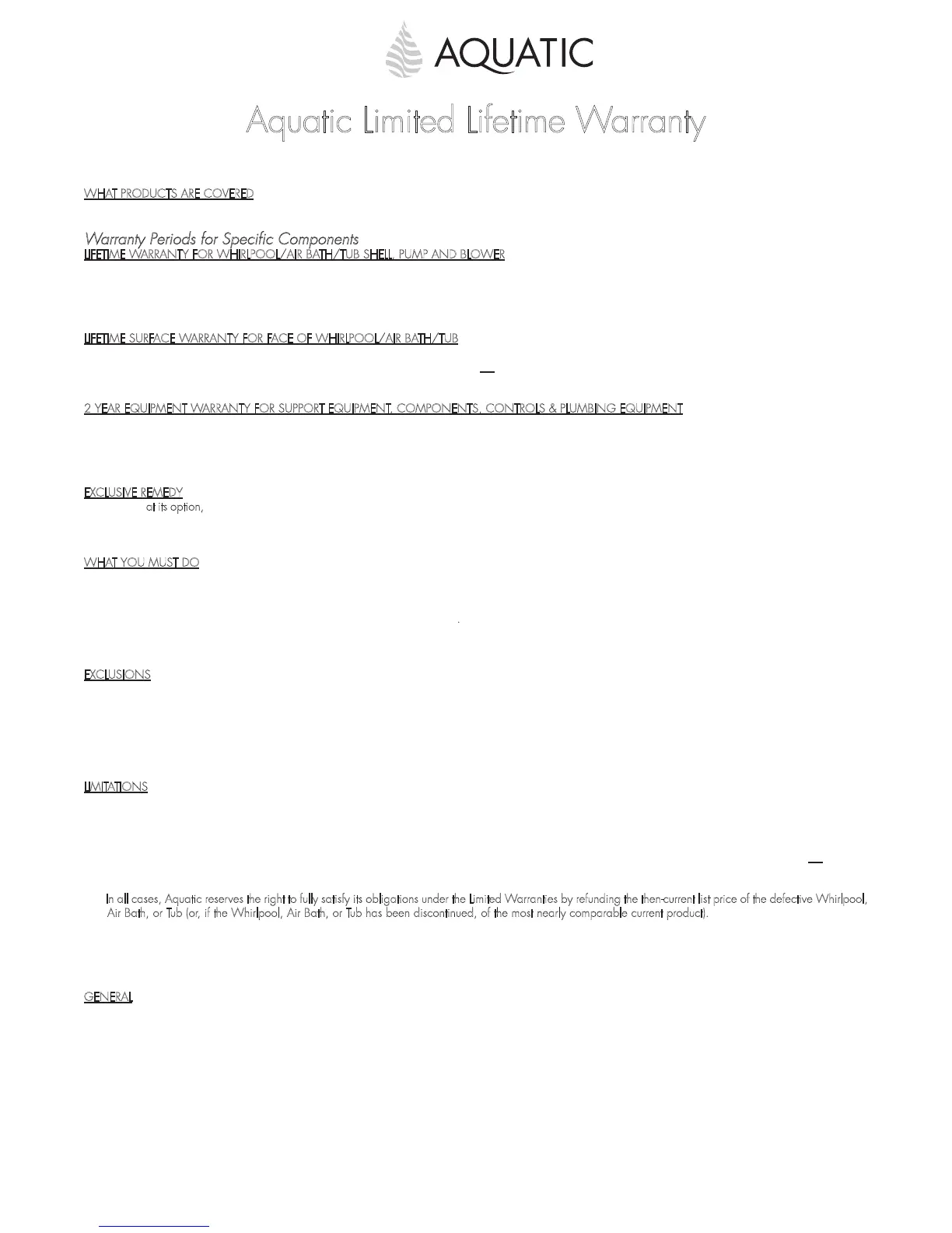 2. In all cases, Aquatic reserves the right to fully satisfy its obligations under the Limited Warranties by refunding the then-current list price of the defective Whirlpool,