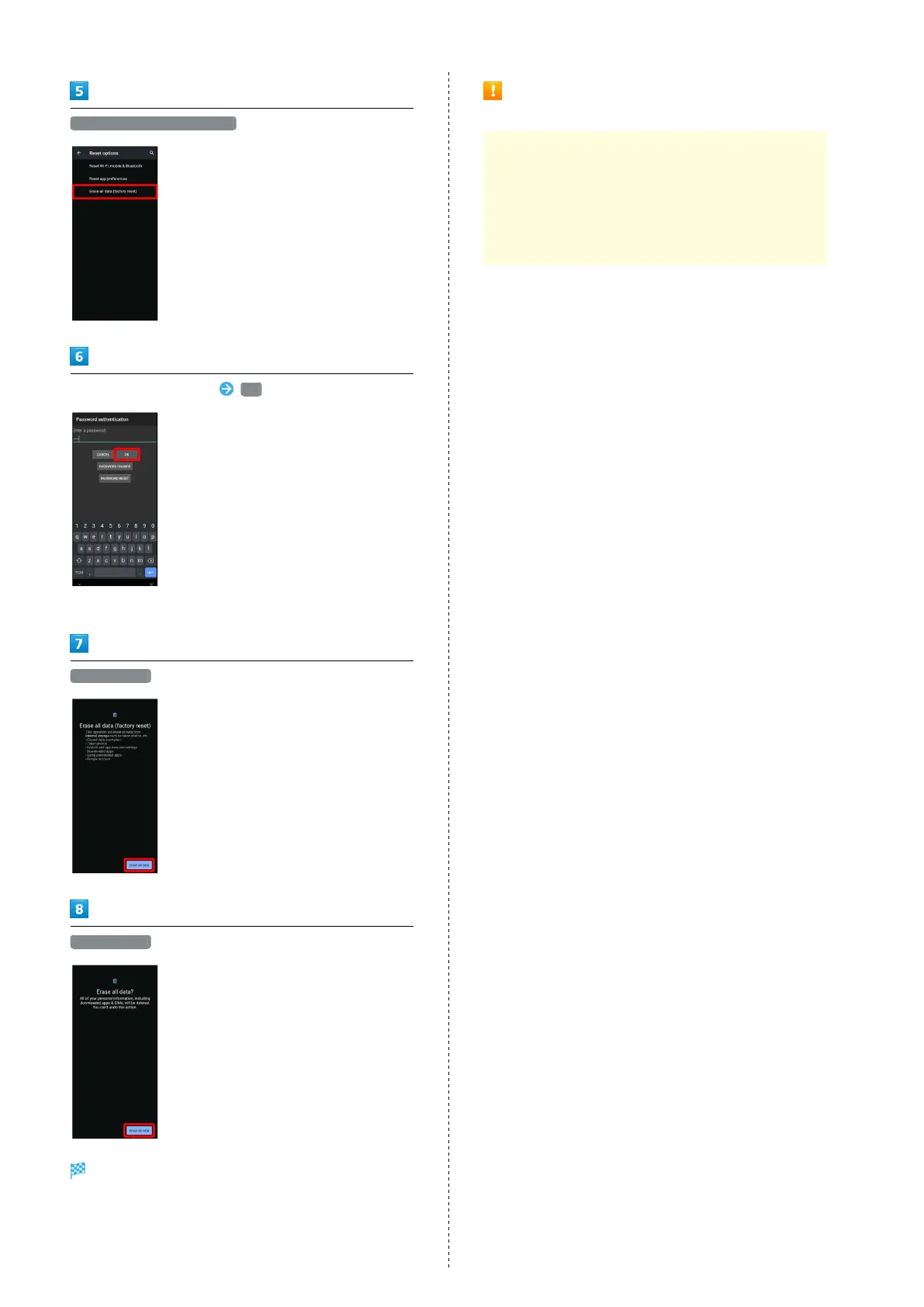 ・Erasing all data (factory reset) deletes all data in