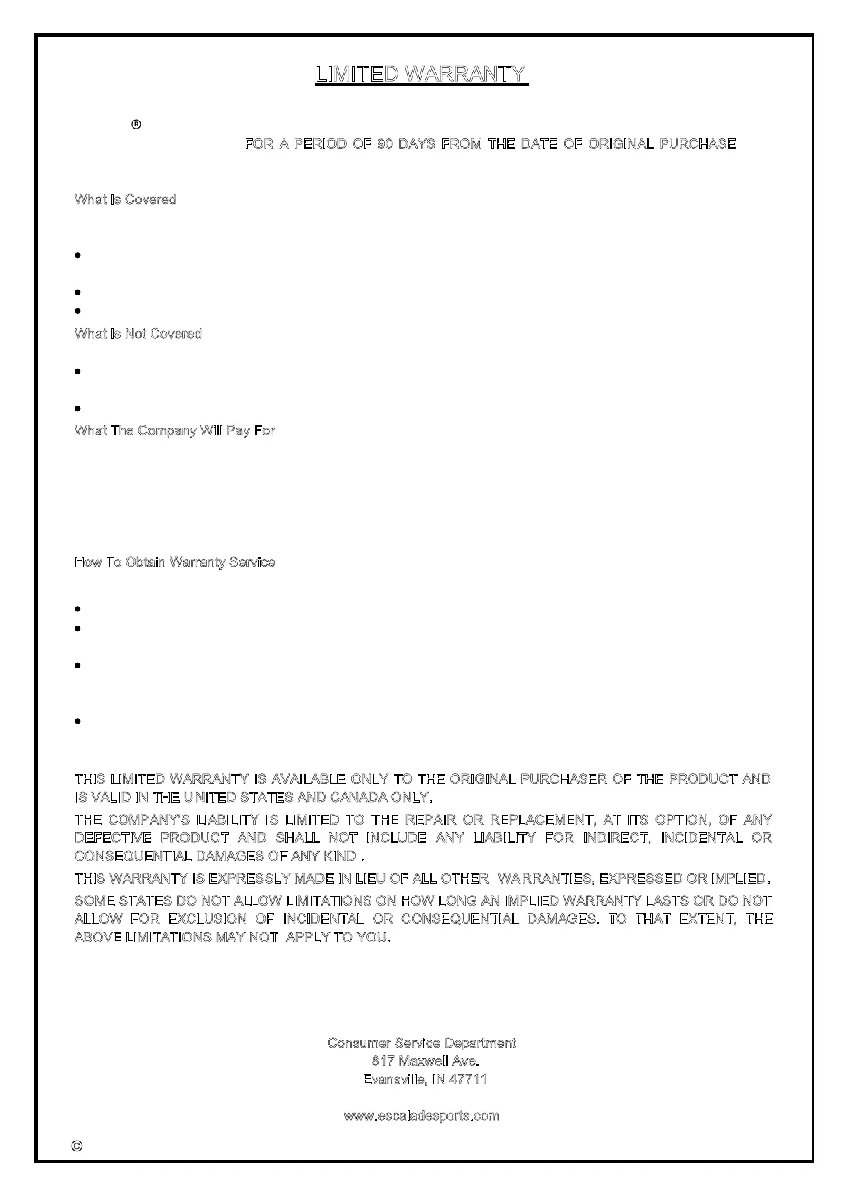 Escalade Sports (the Company) warrants the Product to be free from defects in workmanship and materials under