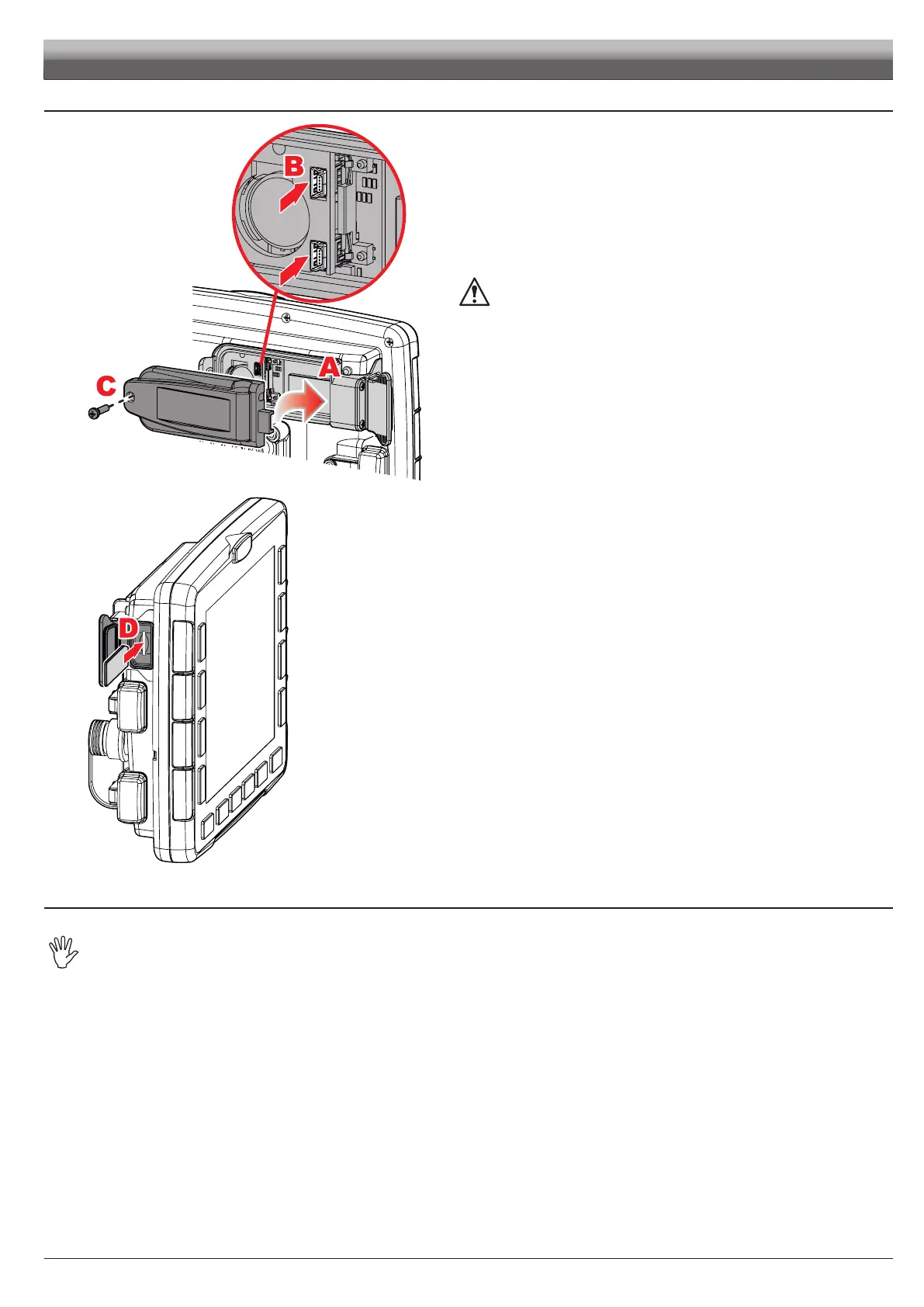 the card cut edge D must be face up; push the card until it engages into place and close the slot with the