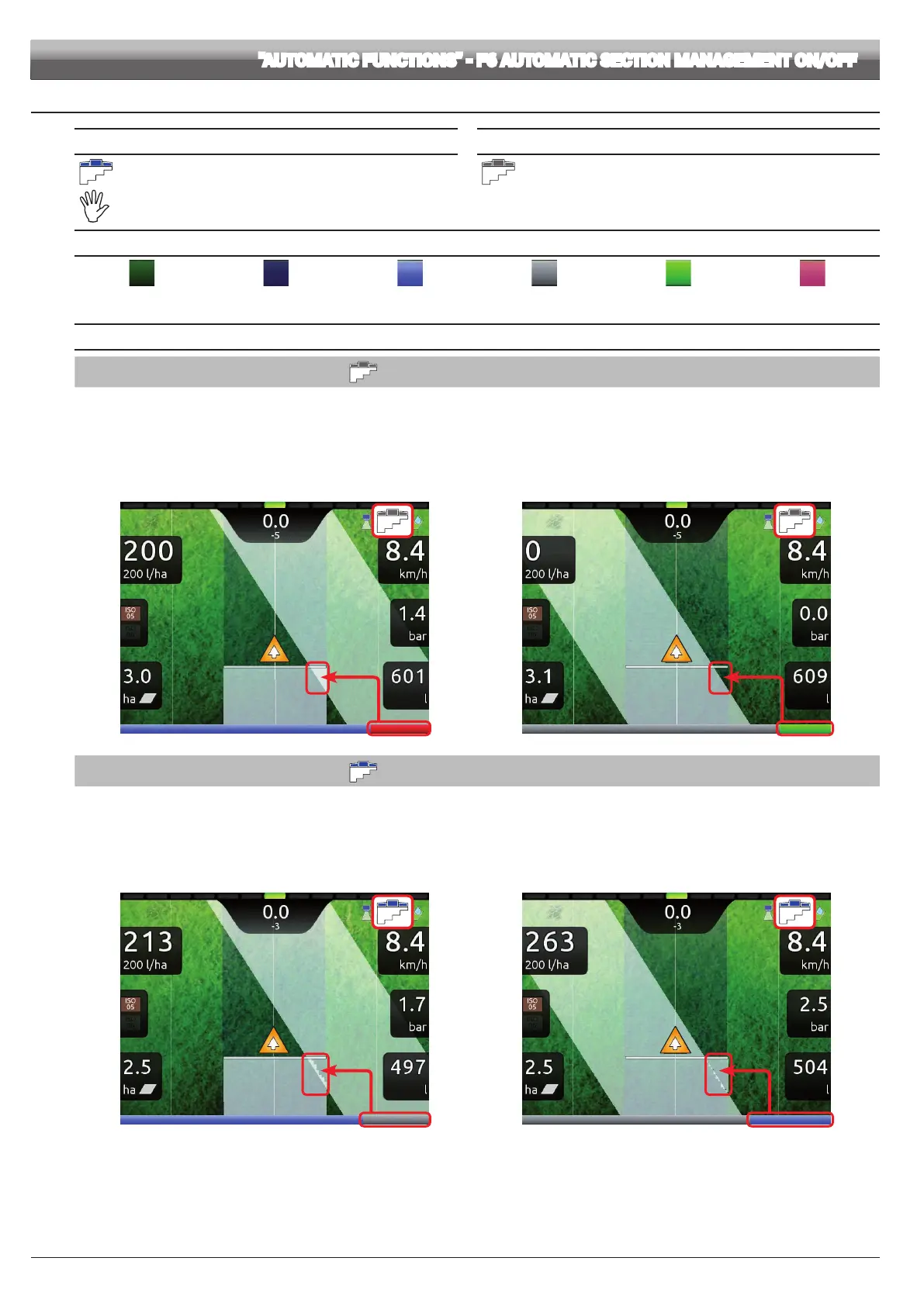To change section valve management mode, use function F6 Automatic section management ON/OFF (par. 13.8).