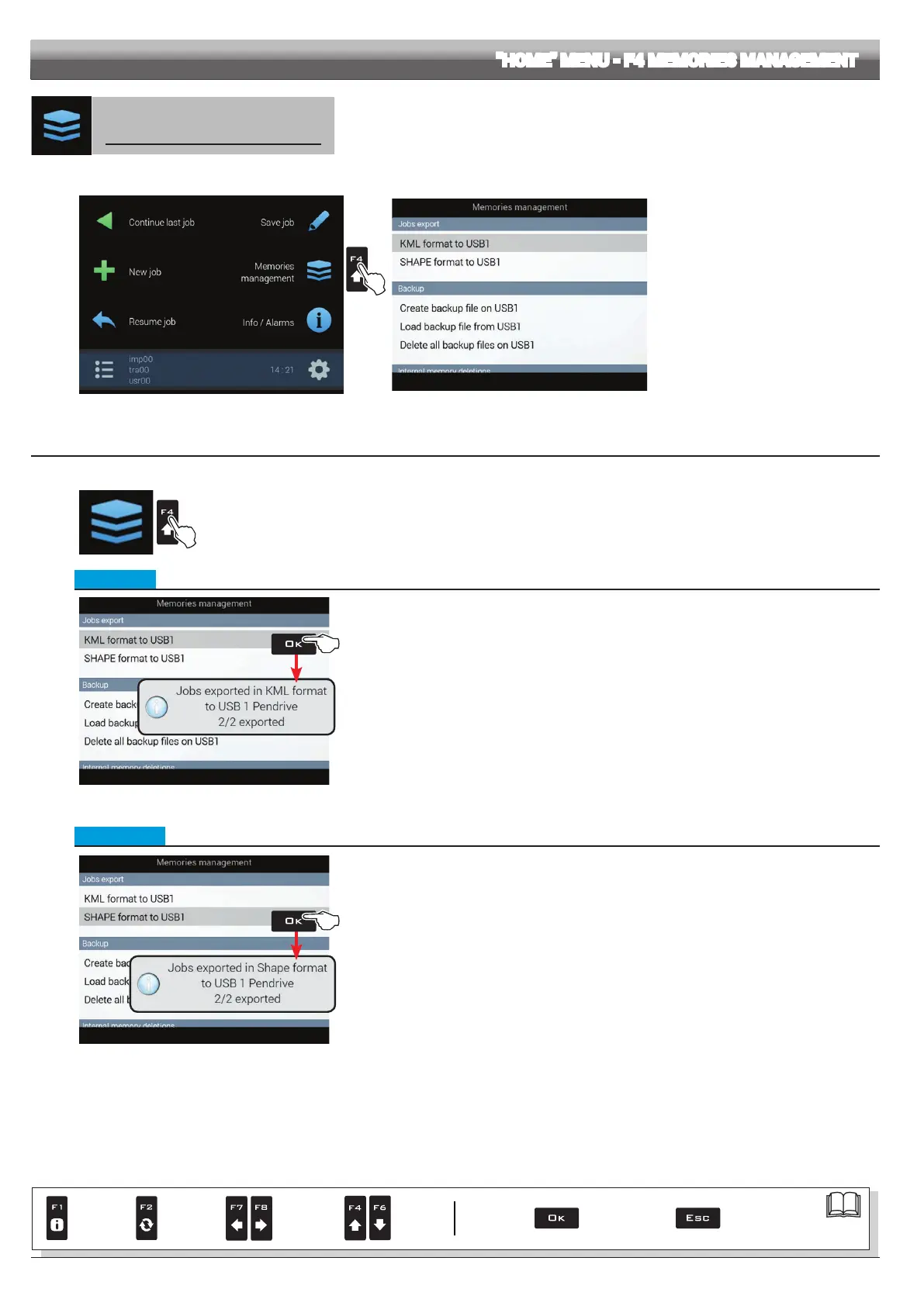 It allows to export in SHAPE format all jobs currently saved in the internal memory and save them to USB