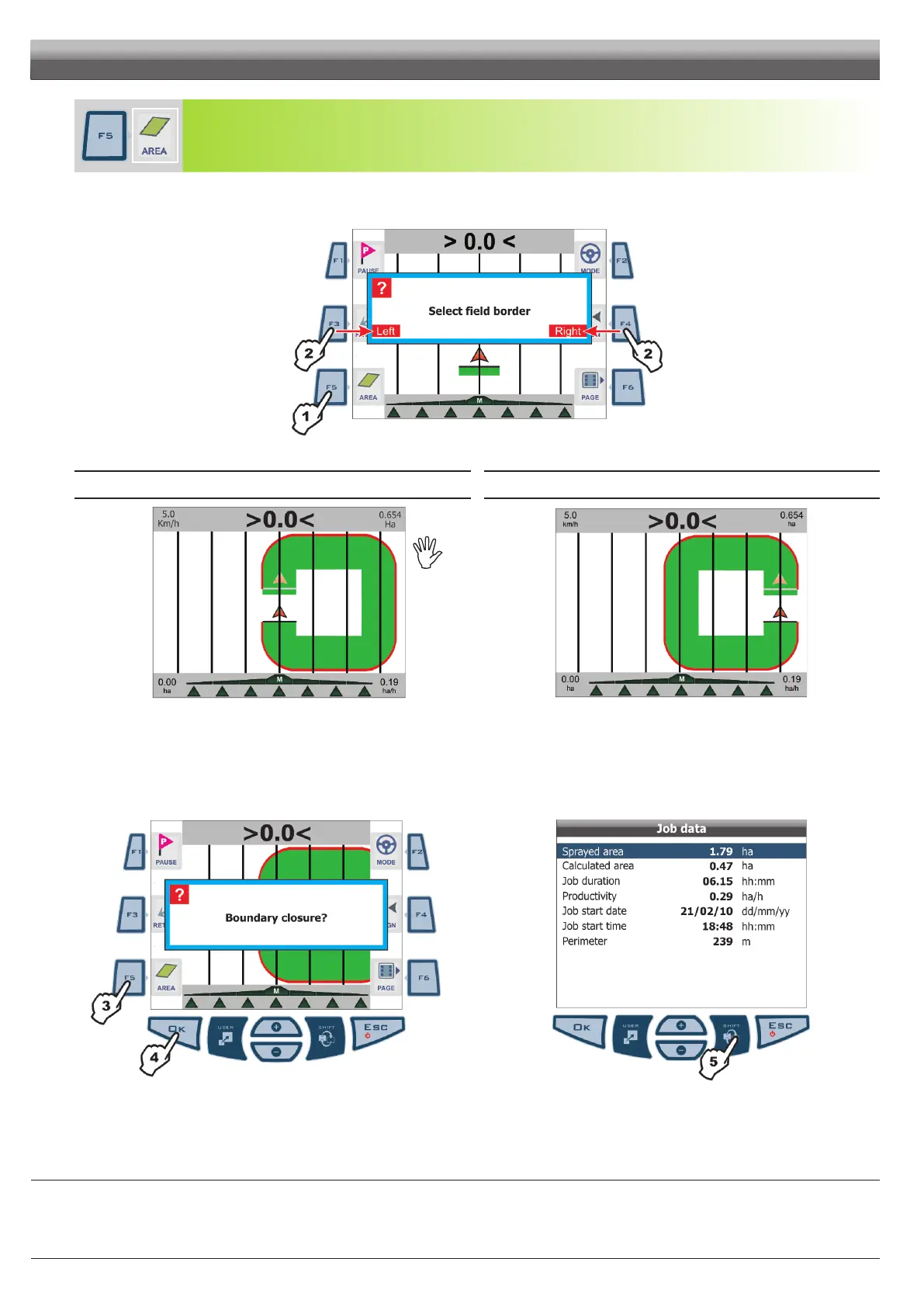 F3 (Left) or F4 (Right): the display will show a red line drawing the eld border as far as the tractor moves along.