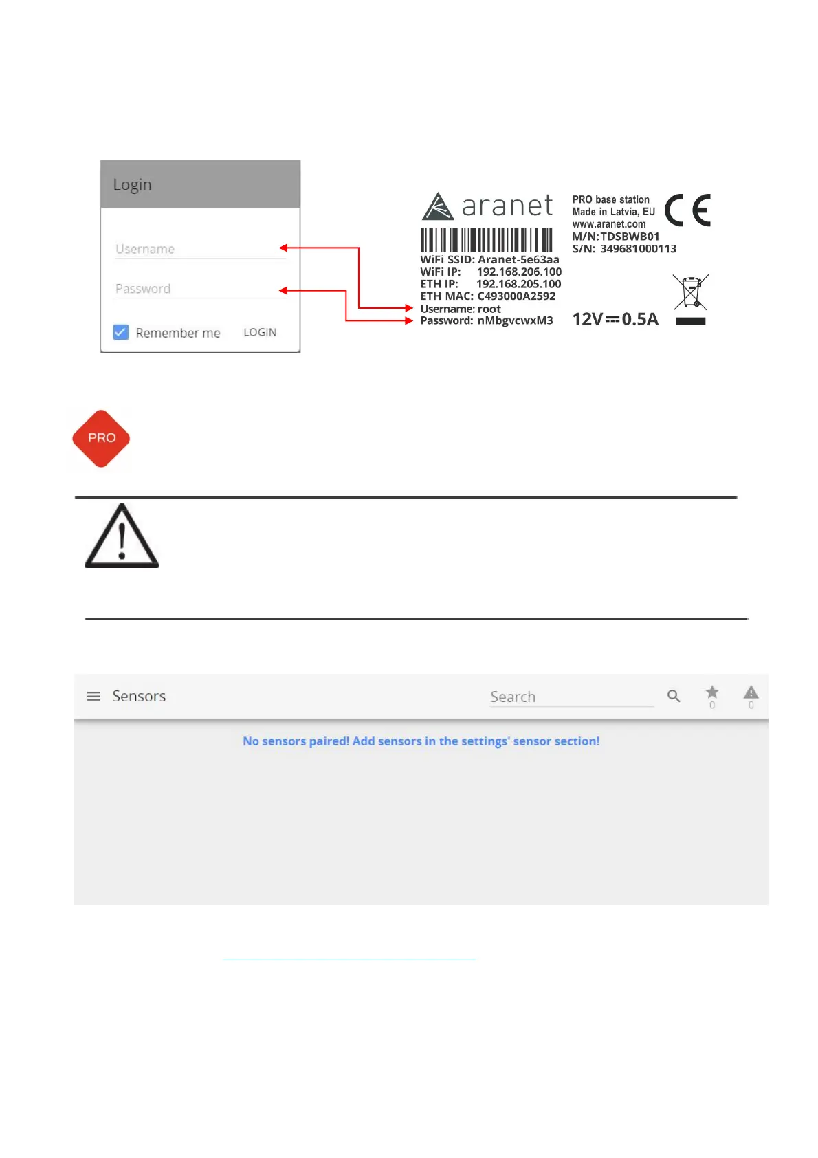Username and password for login can be found on the label attached to Aranet PRO/PRO+ (see example