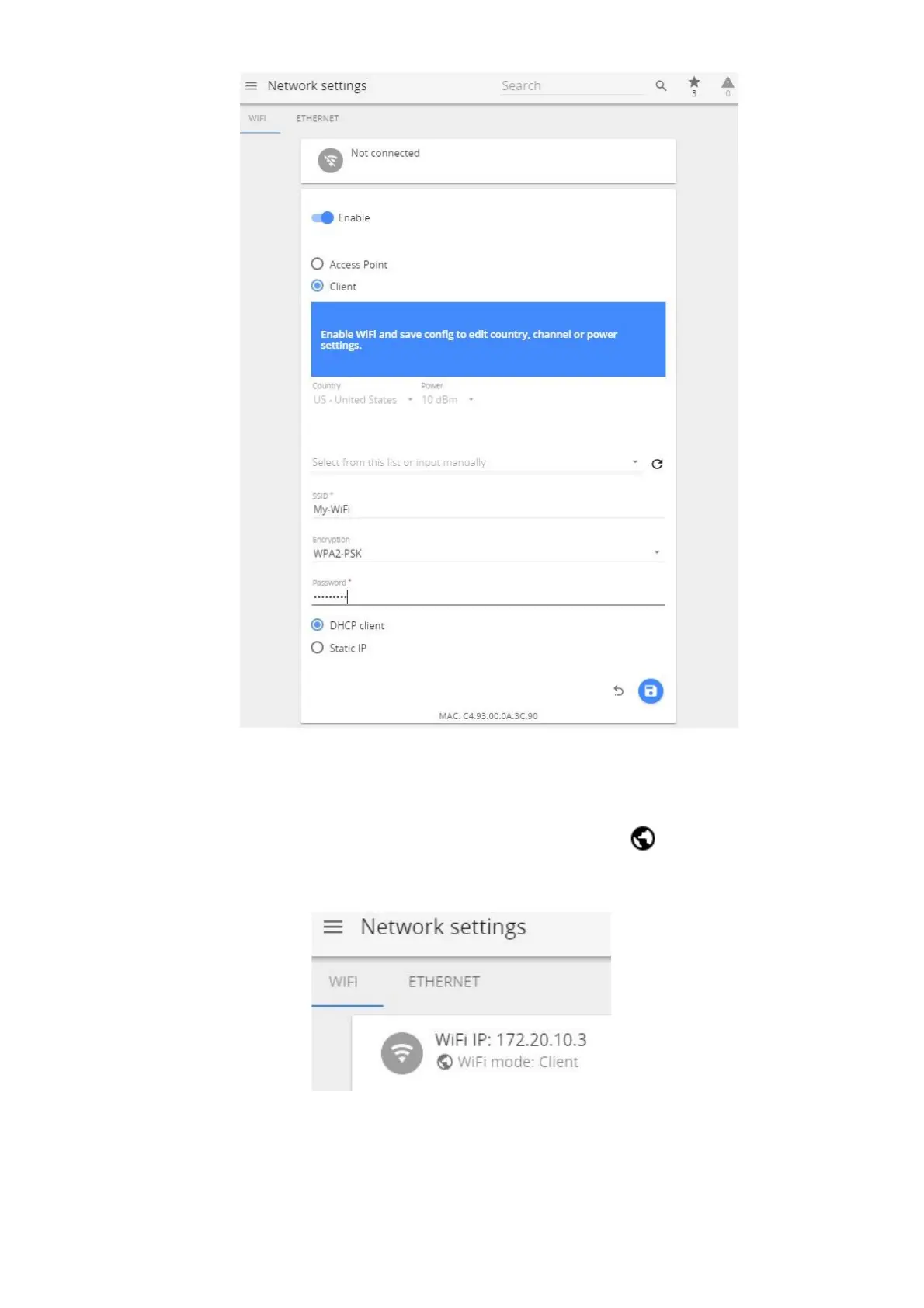 shown in picture below (Wi-Fi IP: xxx.xxx.xxx.xxx). Note the globe symbol is not crossed, which