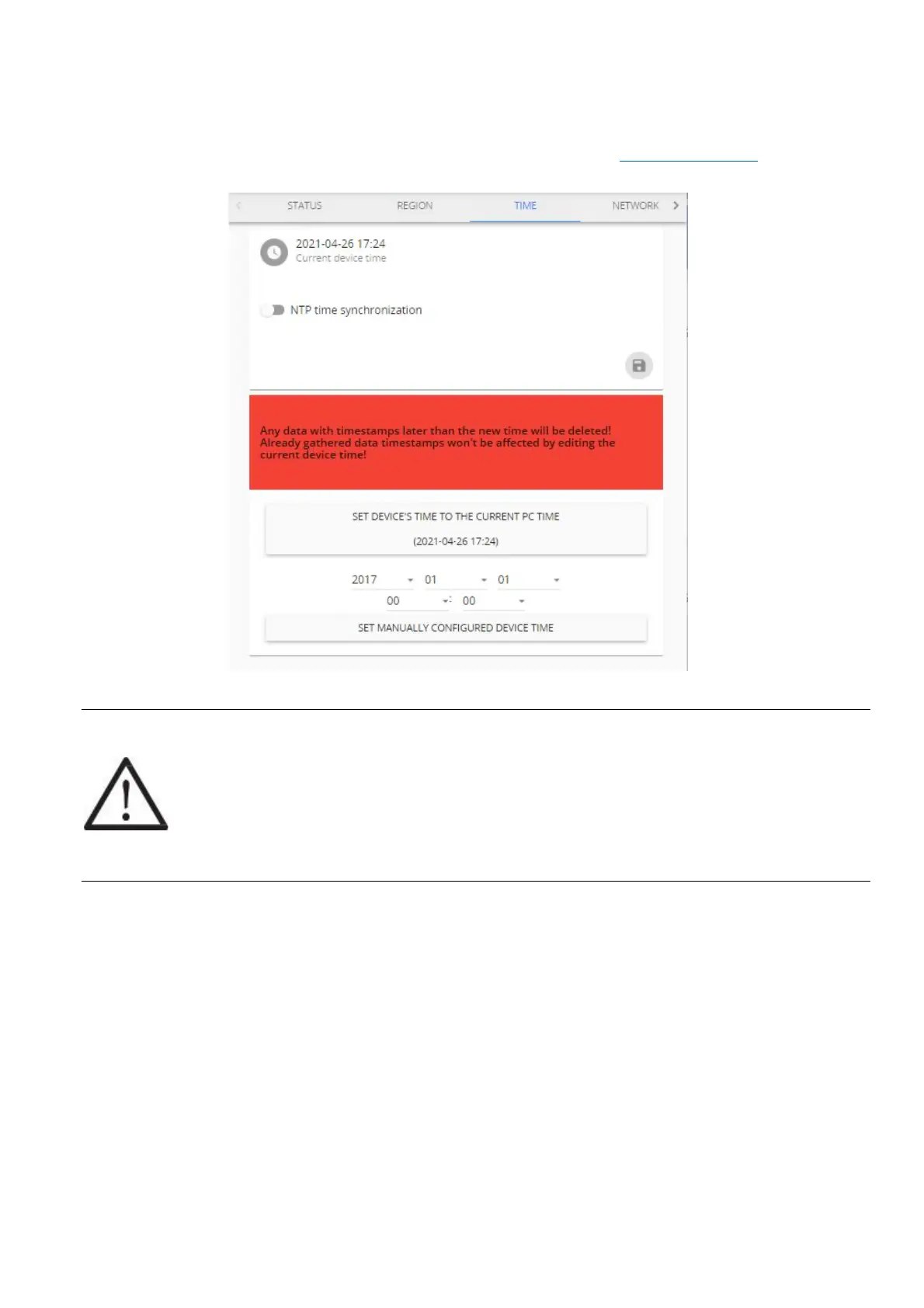 !NOTE! If device time is adjusted backwards, any data previously gathered with a timestamp
