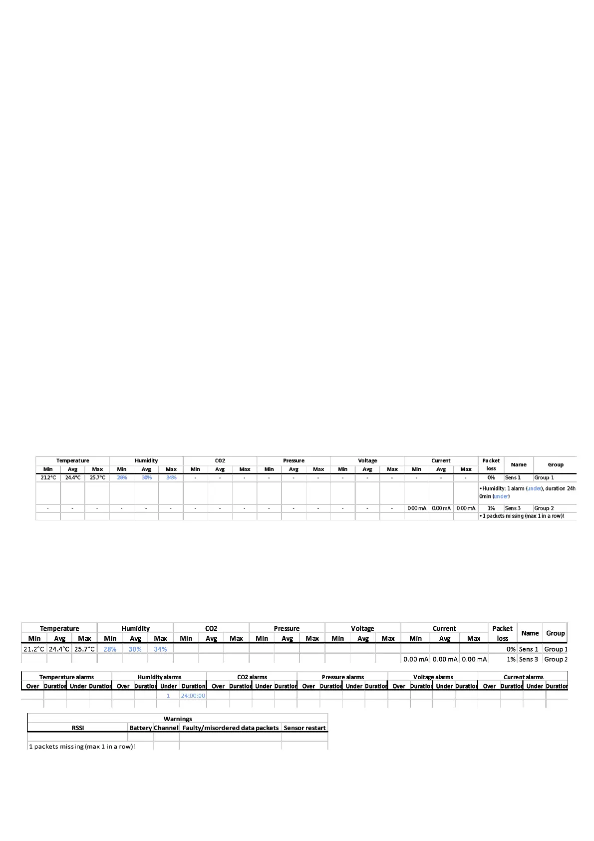 • Minimum, average and maximum of Temperature, Humidity, CO2, Pressure, Voltage,