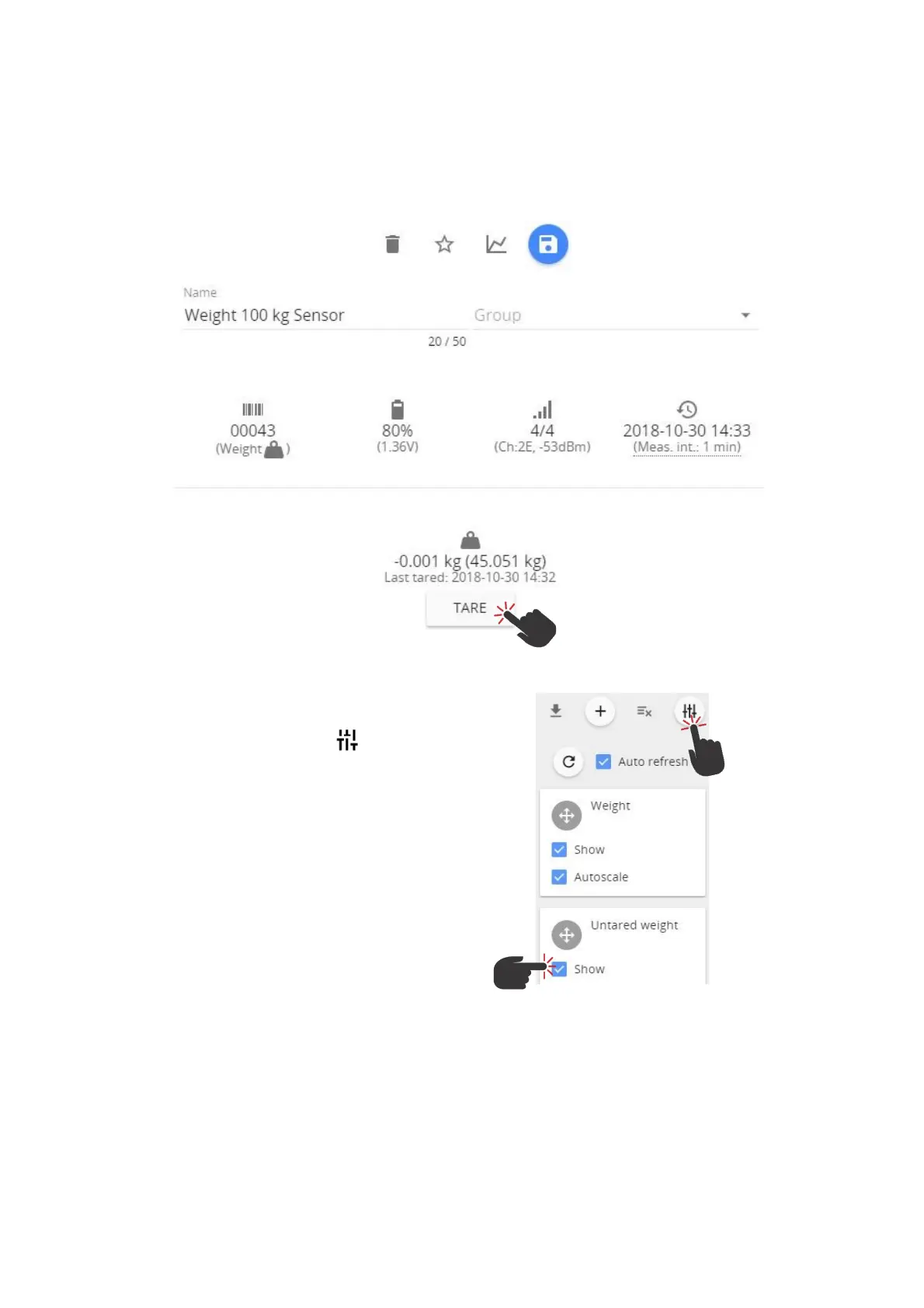 To reset the zero offset of weight (tare), click on the TARE button. The last measured tared and (untarred