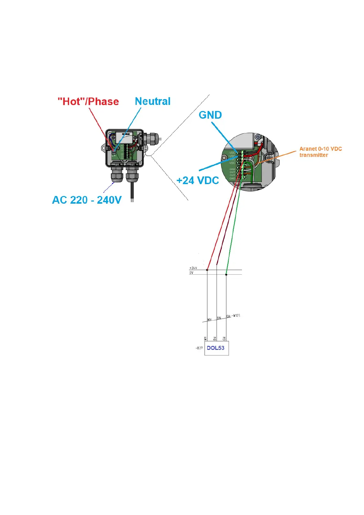 transmitter are connected to junction box which is powered by 220-240 VAC. In addition, Aranet 0-10V