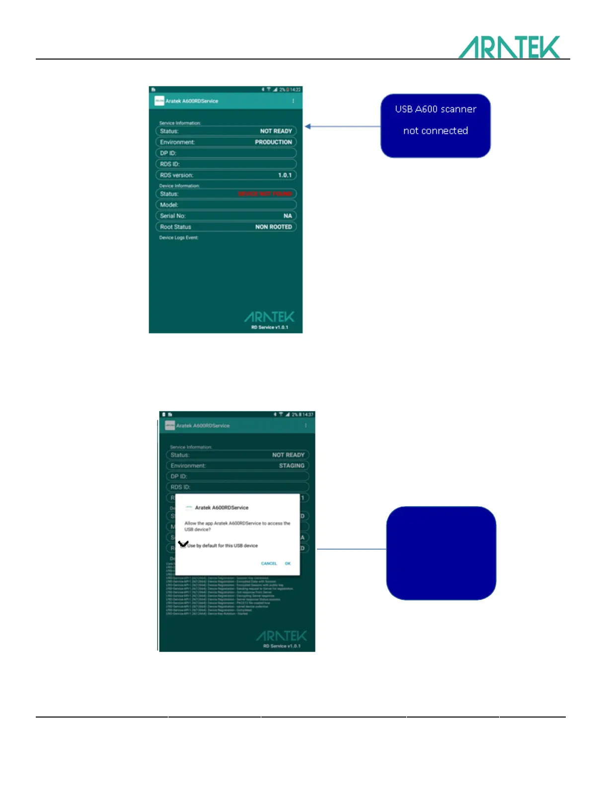 Aratek A600 - Device Connectivity and Status; USB Device Connection; USB Permission Prompt