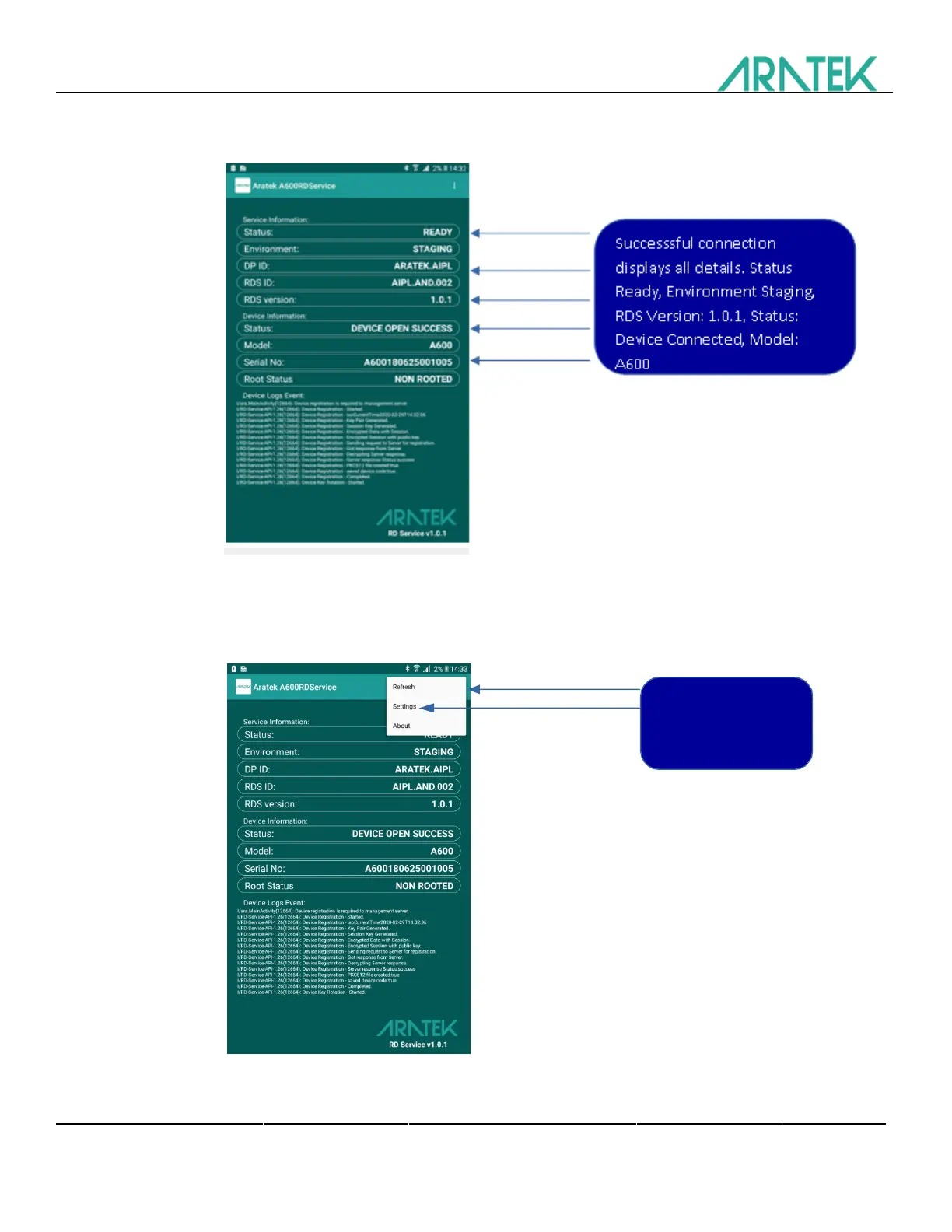 Aratek A600 - Application Configuration; Successful Connection Status; Accessing Settings