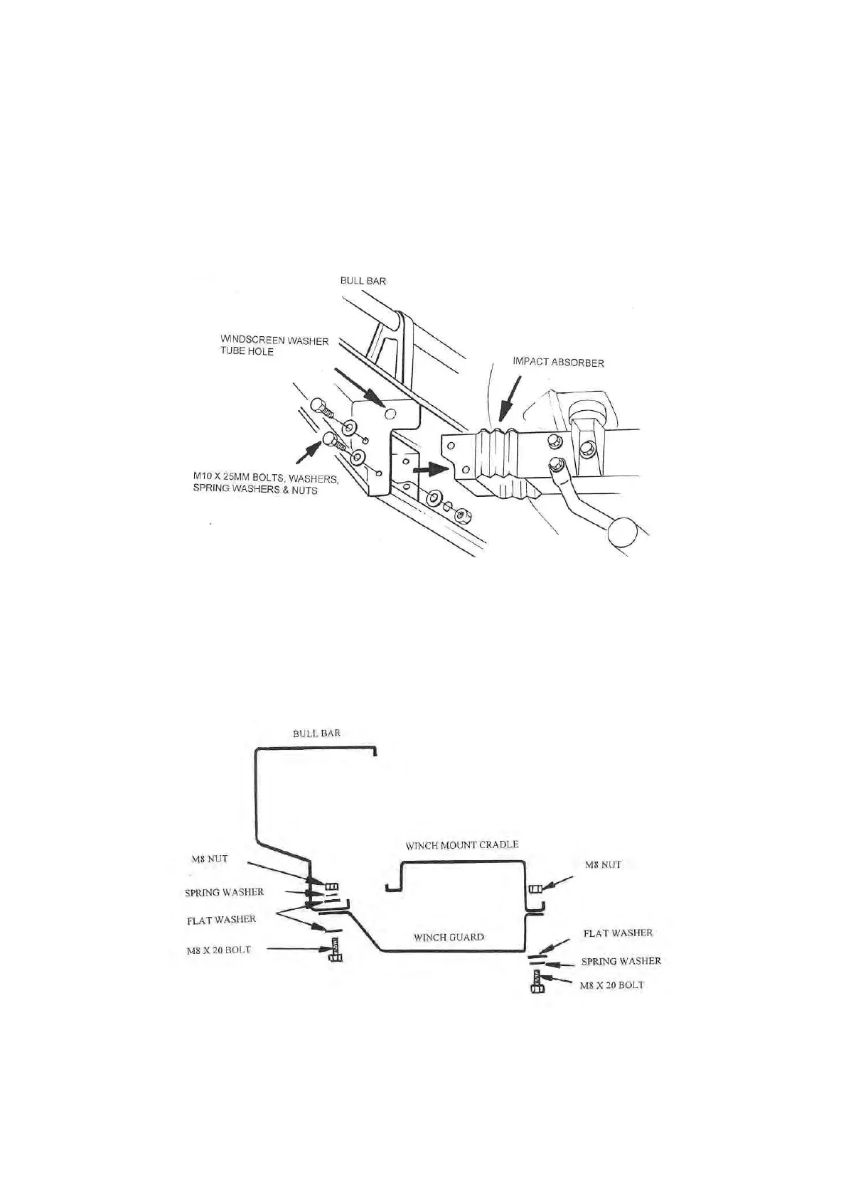 cradle using the M8 x 20mm bolts, flat washers, spring washers and nuts. Align the guard with the bull bar then