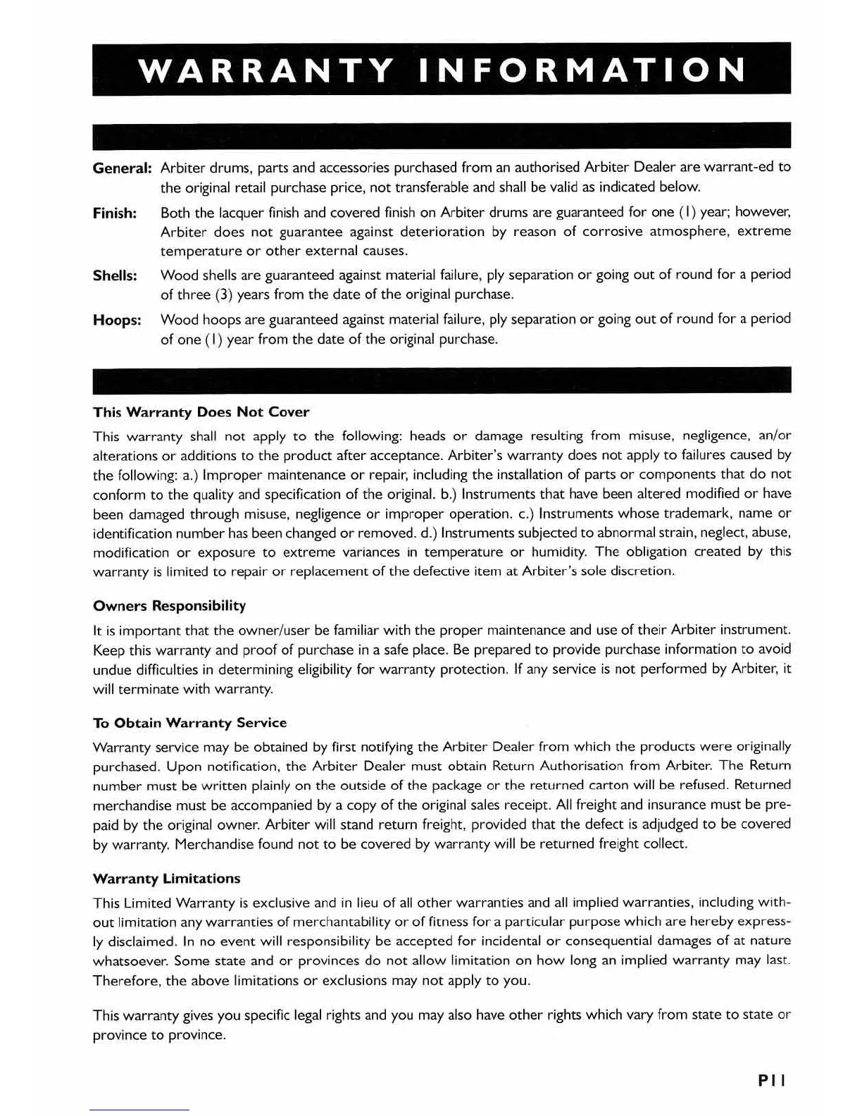 Arbiter Flats - Warranty Information; General Warranty Coverage; Warranty Exclusions; Owners Responsibility
