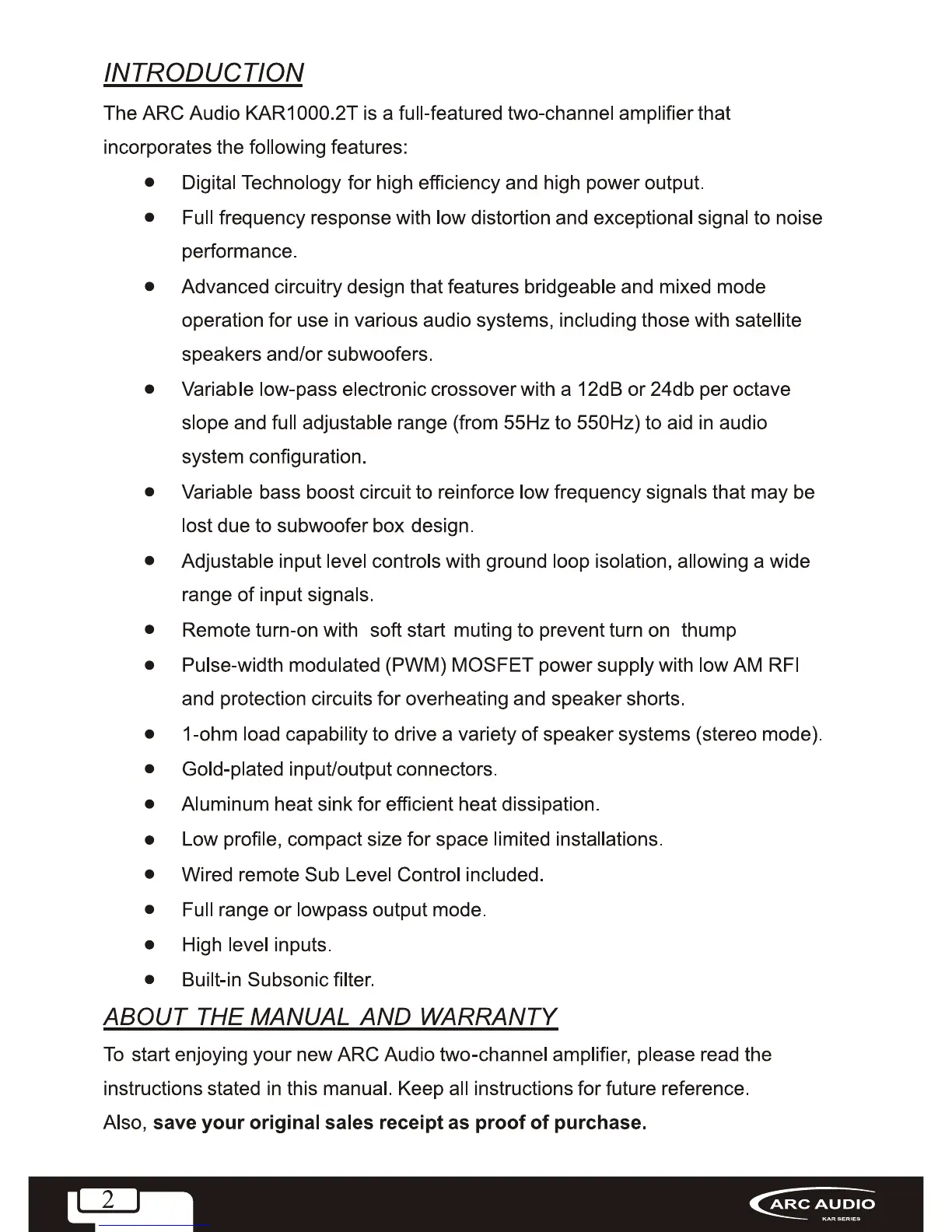 ARC Audio KAR1000.2T - Introduction; About the Manual and Warranty