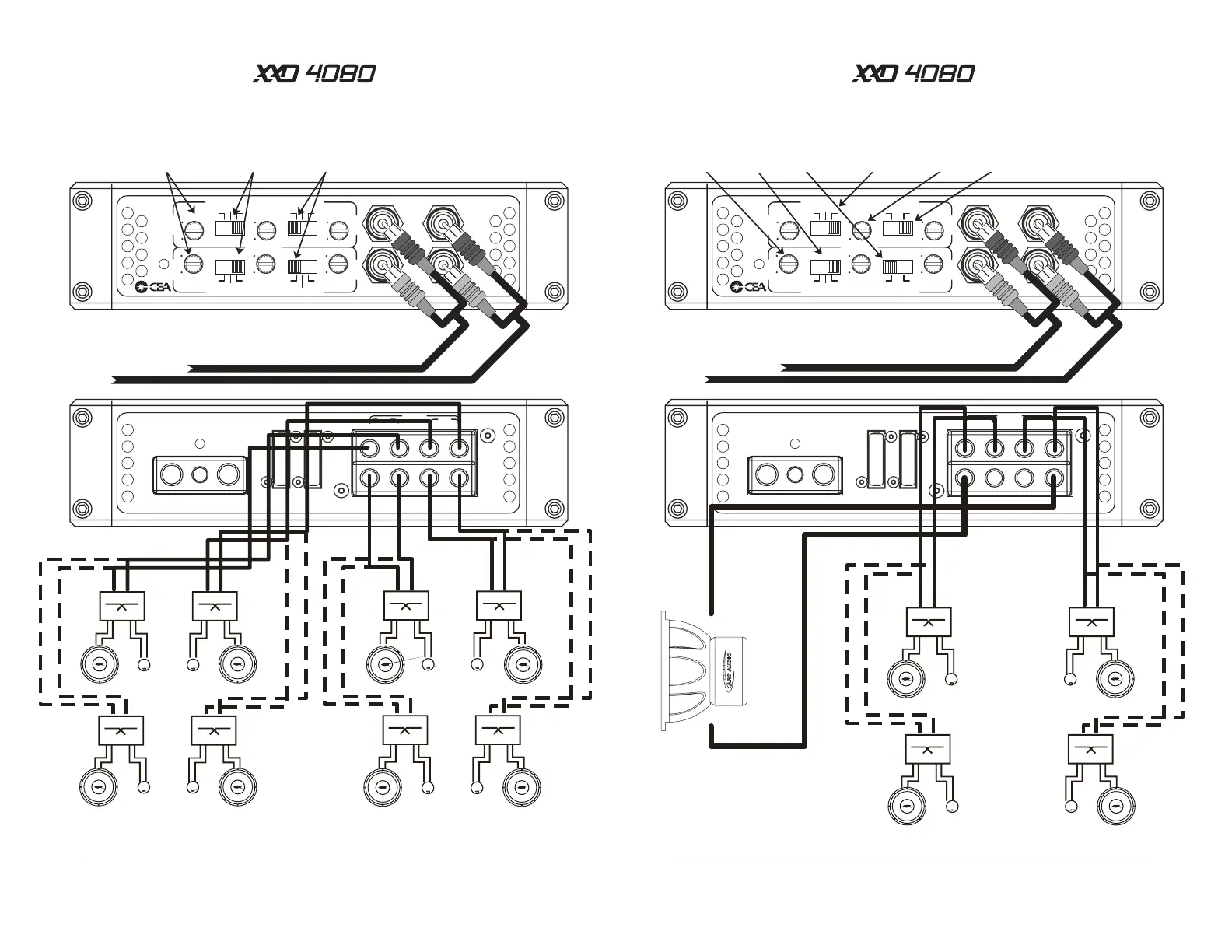 ARC Audio XXD - Amplifier Wiring Configurations; XXO 4080 Stereo 4 Channel High Pass Wiring; XXO 4080 Stereo High Pass with Mono Subwoofer Wiring