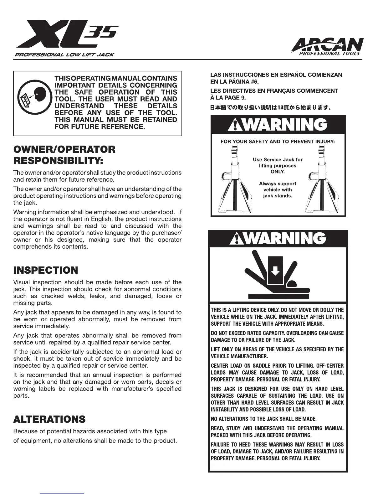 Arcan XL35 - OWNER;OPERATOR RESPONSIBILITY; INSPECTION; ALTERATIONS; SAFETY WARNINGS