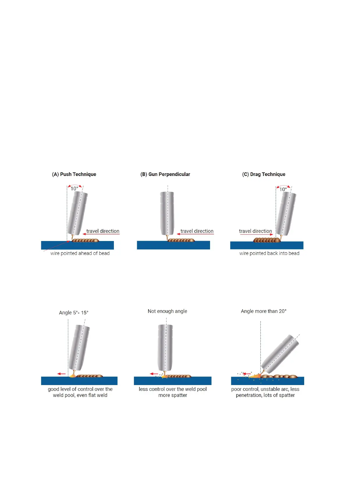 ideal and produces a good level of control over the weld pool. A travel angle greater that 20° will