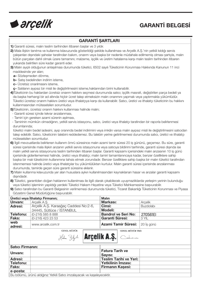 www.arcelik.com.tr Azami Tamir Süresi: 20 İș günü