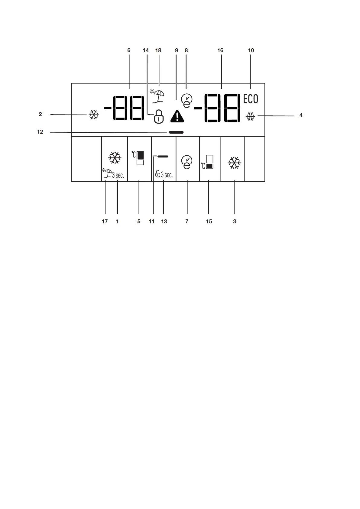 10. Economy Mode Icon (illuminated when fridge compartment temperature is set to +8 and