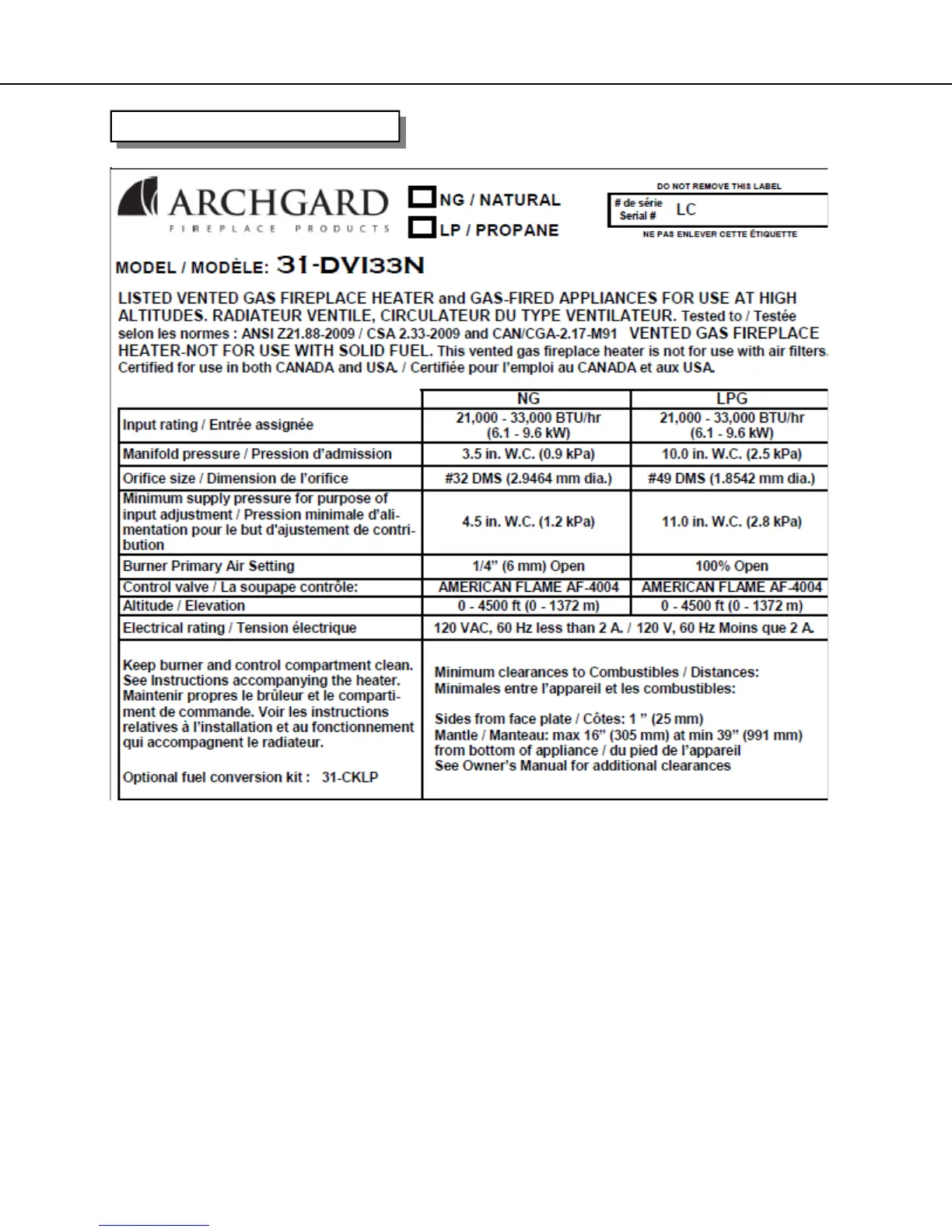 Archgard 31-DVI33N - Rating Plate