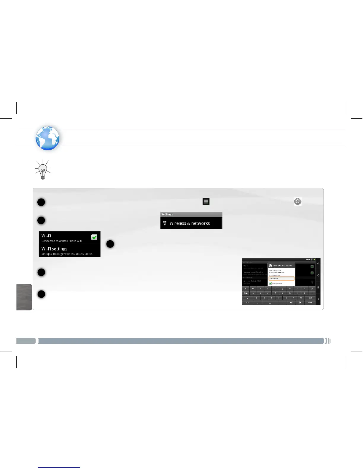 [Kablosuz ayarları] seçeneğini belirleyin. ARCHOS mevcut WiFi ağlarını tarayacak ve ekranın alt
