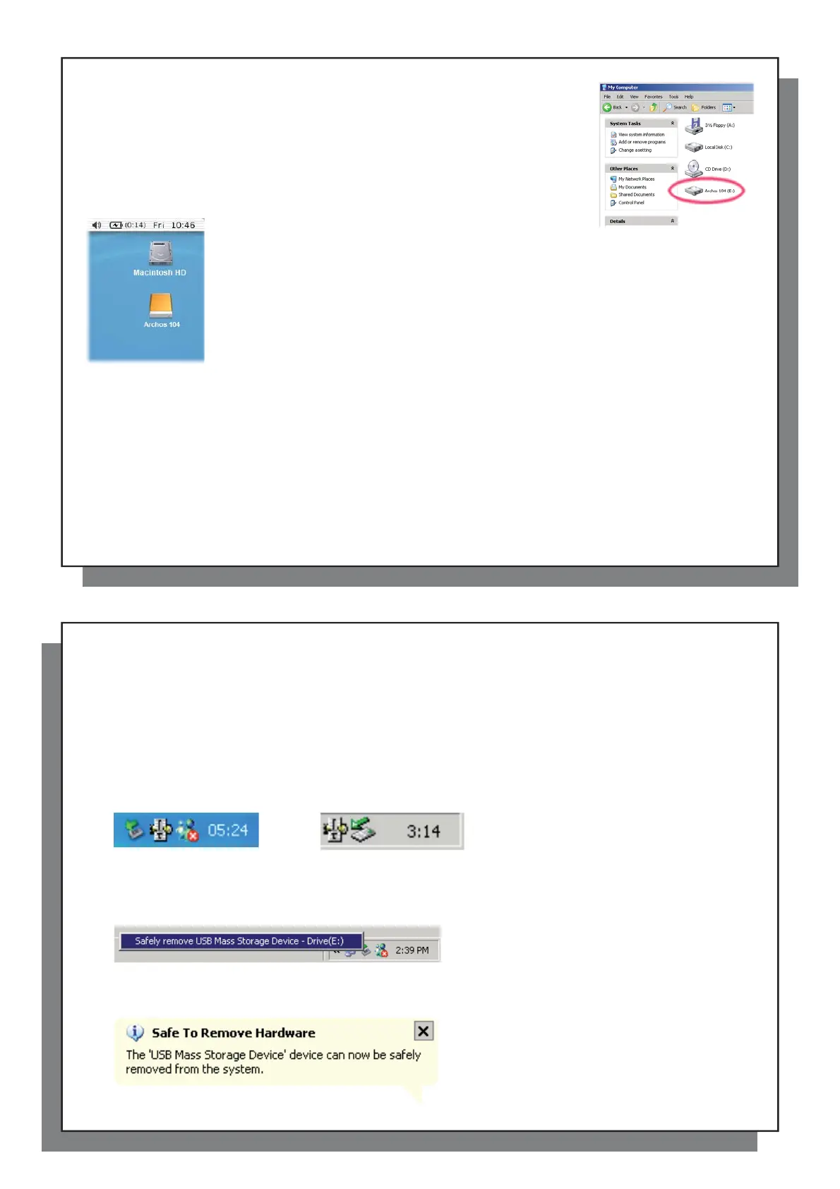 To safely disconnect the Archos™ 104 hard drive, click on the system tray remove icon (green arrow as shown