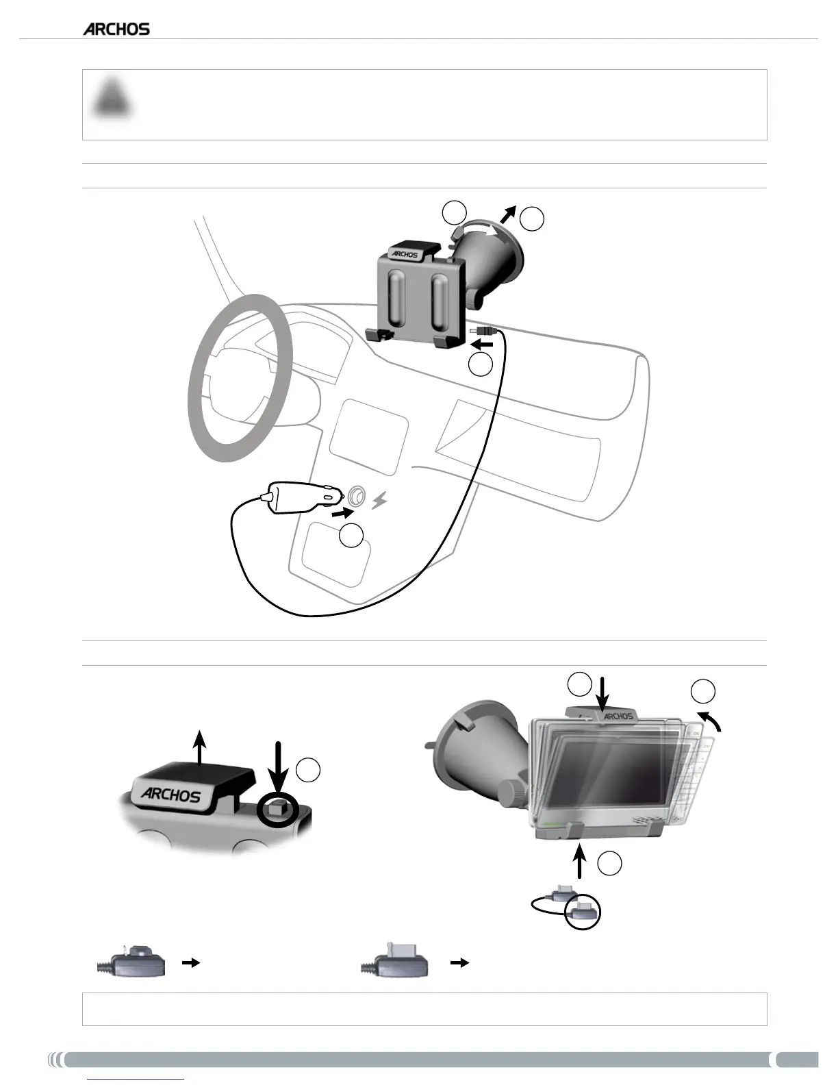 Pour déconnecter votre lecteur ARCHOS du support voiture, suivez cette même procédure en inversant l’ordre des étapes.