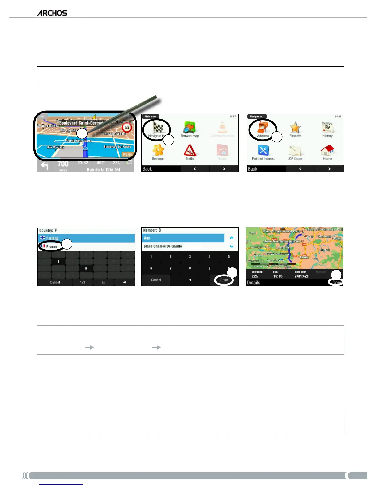 Patientez pendant que le l’ARCHOS calcule l’itinéraire. Celui-ci apparaît ensuite sur la carte*.